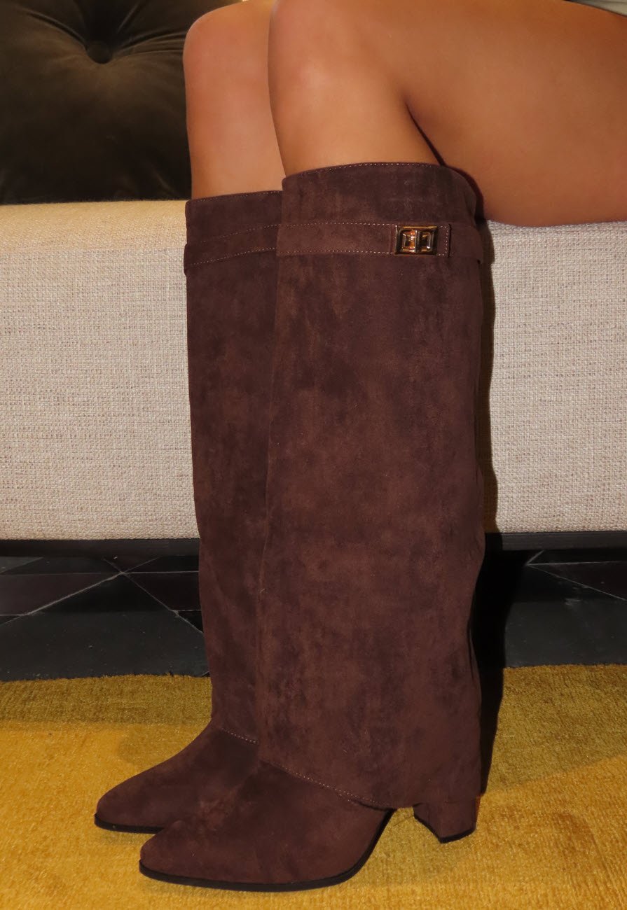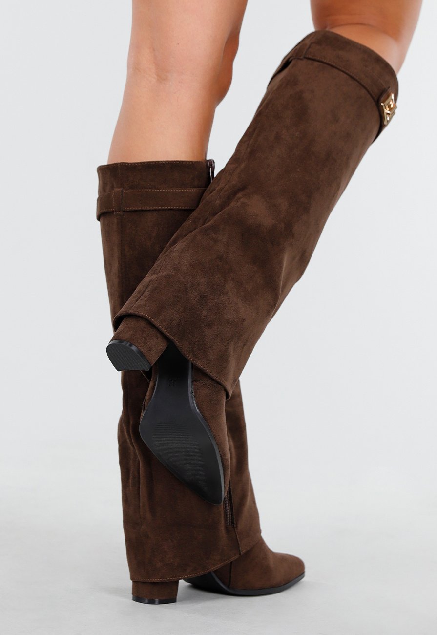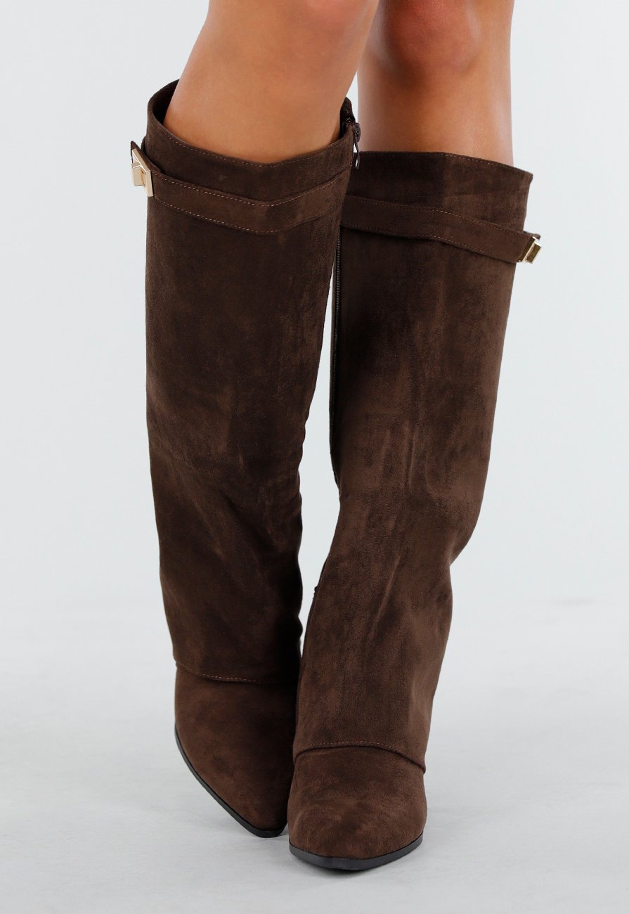 Deze donkerbruine overlap laarzen zijn uitgevoerd in een suèdelook materiaal met zachte textuur. De schacht valt wijd en overlapt over de wreef. De laars is voorzien van een rits aan de binnenzijde en heeft een goudkleurige gesp bovenaan de schacht. De neus is spits gevormd en de zool is voorzien van een blokhak.
