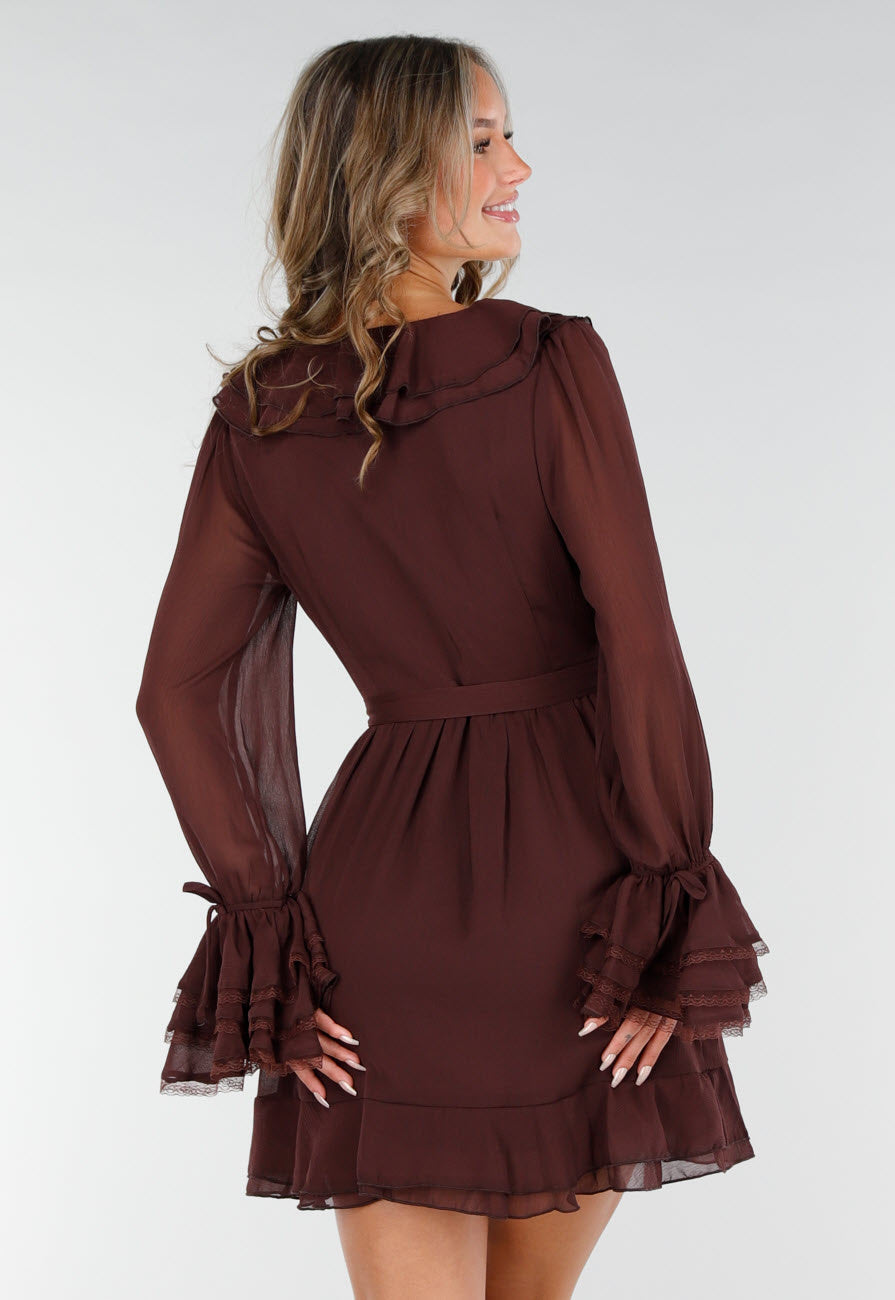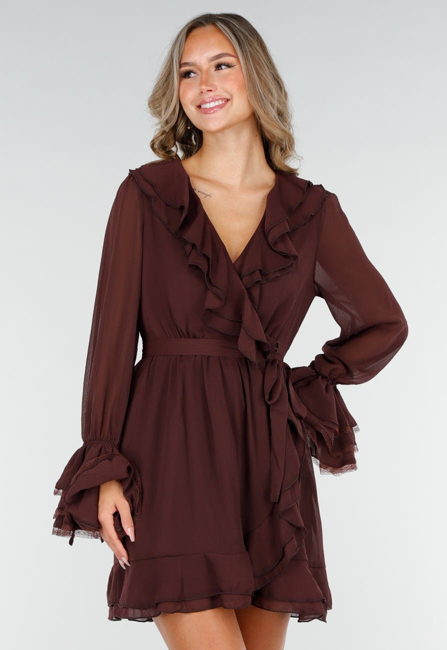 Deze jurk is uitgevoerd in een bruine chiffonlook stof met een subtiele structuur. De lange mouwen zijn afgewerkt met elastiek en brede volantboorden met kanten rand. De jurk sluit met een strikceintuur in de taille en heeft een overslagmodel met ruche langs de halslijn en zoom. De binnenzijde is gevoerd, de mouwen zijn licht doorschijnend.
