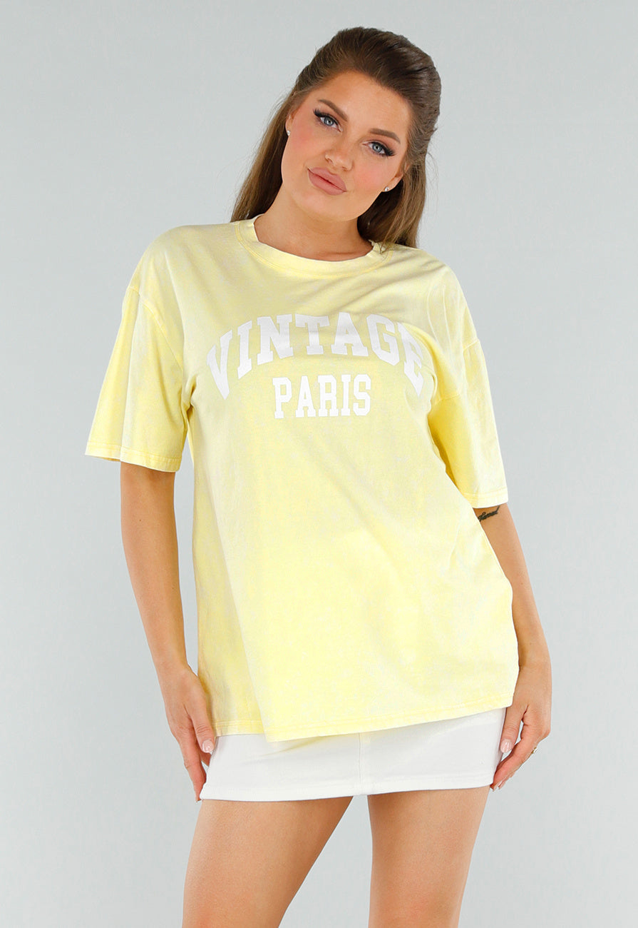 Dit lichtgele T-shirt heeft een acid wash print en is bedrukt met het woord “Vintage Paris” in neon roze letters op de voorzijde. Hij heeft een rechte pasvorm en is voorzien van een ronde hals en korte mouwen die halverwege de armen vallen door de oversized fit. Het shirt is gemaakt van stretchmateriaal dat comfortabel meebeweegt met het lichaam.