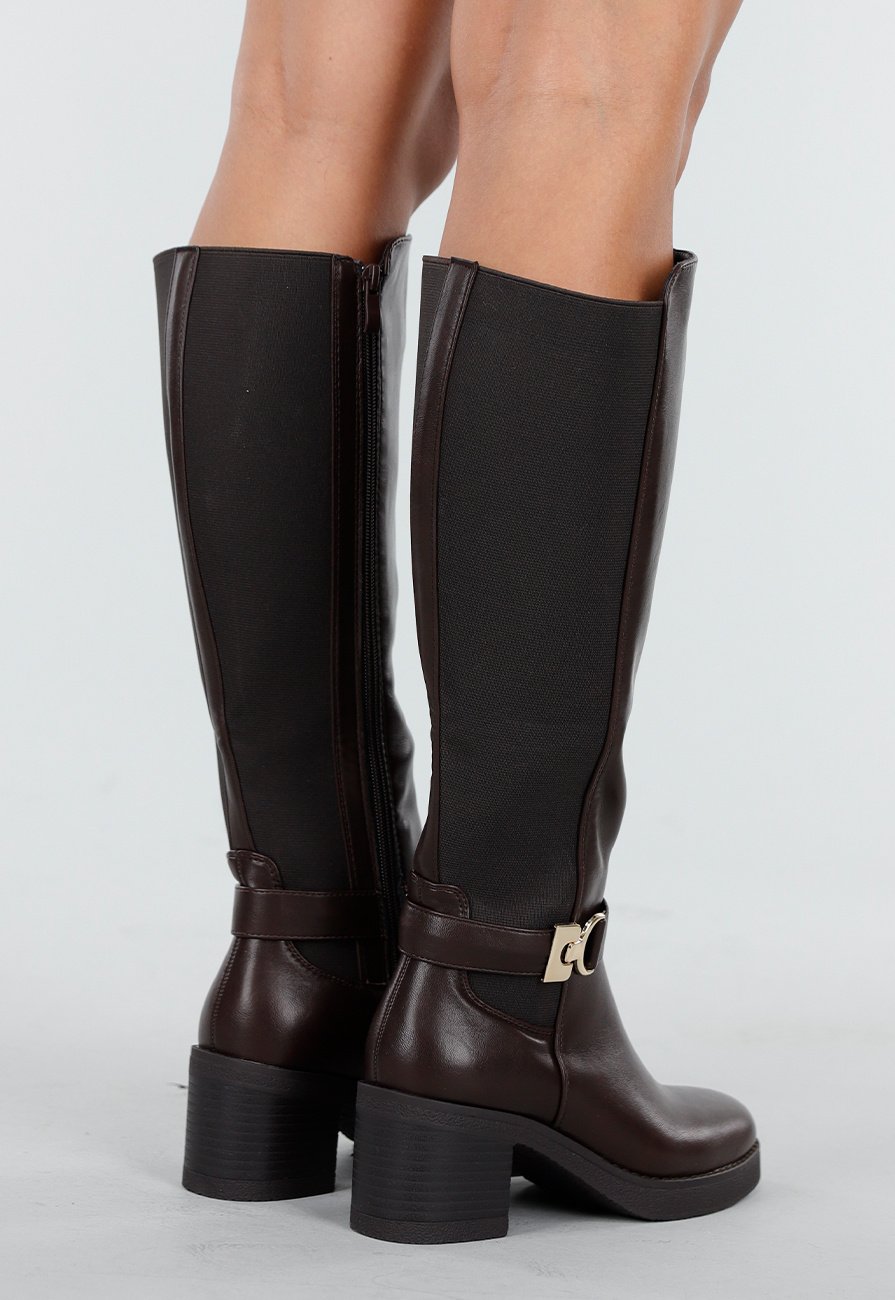 Deze donkerbruine laarzen zijn uitgevoerd in een kniehoog model met blokhak. De laars sluit met een ritssluiting aan de binnenzijde en heeft een halfronde neus. Aan de buitenzijde is een band met goudkleurige gesp zichtbaar als detail. De achterzijde van de schacht is voorzien van een elastisch inzetstuk voor extra draagcomfort.