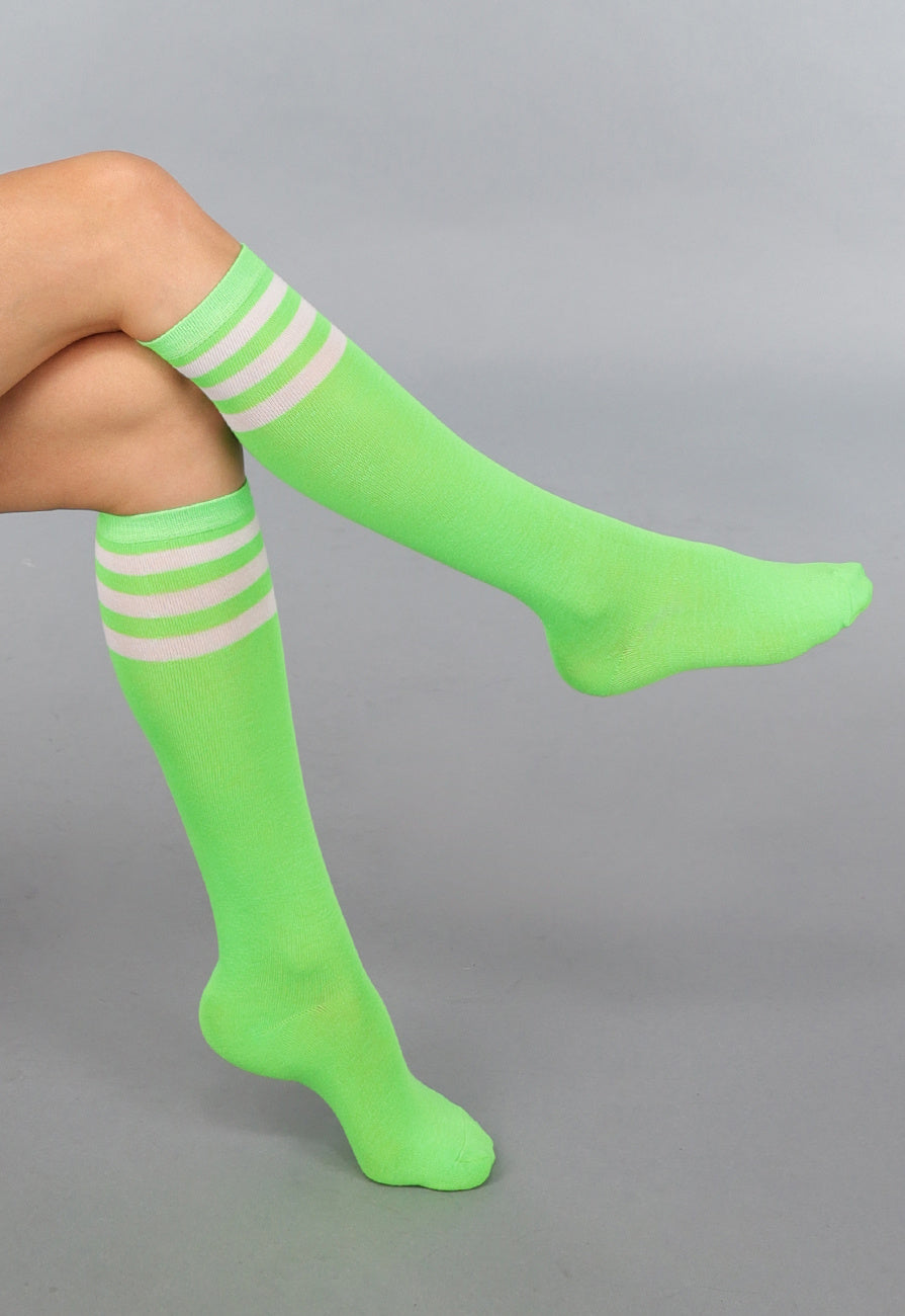 Deze sokken vallen tot onder de knie en zijn gemaakt van een stretchy stof. Ze zijn neon groen van kleur en voorzien van drie witte strepen aan de bovenkant.