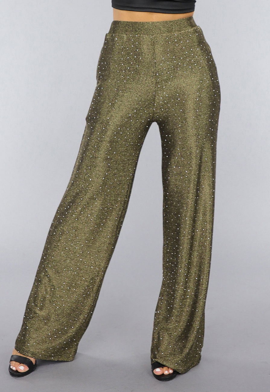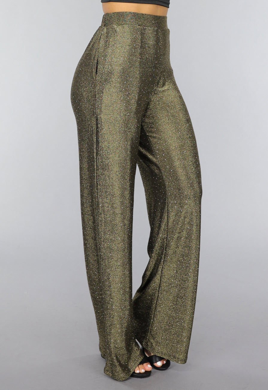 Gouden Wide Leg Pantalon met Glitter Steentjes