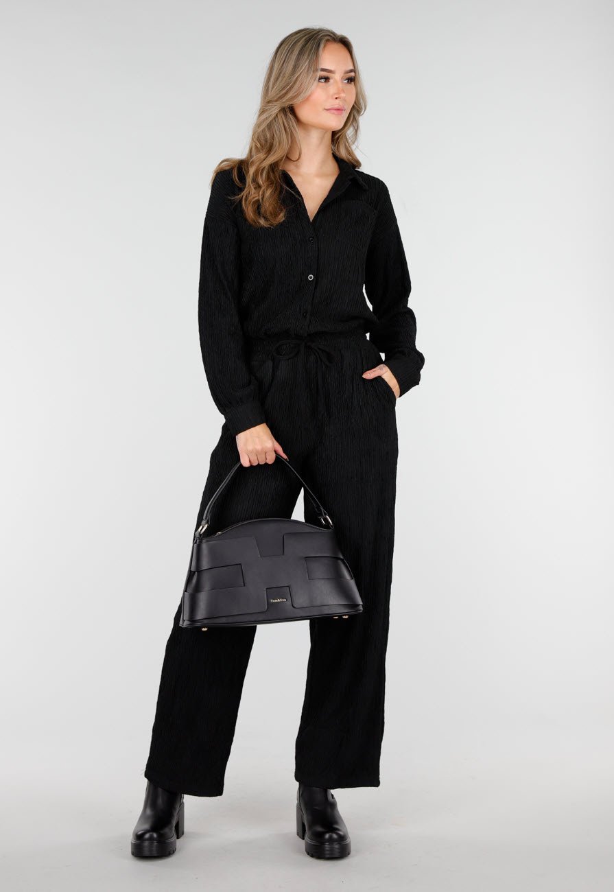 Deze zwarte handtas is gemaakt van imitatieleer en voorzien van een geometrisch ingelegd patroon aan de voorzijde. Het model heeft een stevige korte draaghengsel bovenop, aangevuld met een afneembaar lang hengsel zodat de tas ook als schoudertas of crossbody gedragen kan worden. Aan de achterzijde bevindt zich een praktische ritsvak, terwijl de onderzijde is afgewerkt met goudkleurige studs die de tas extra bescherming geven. Het ruime interieur maakt dit model geschikt voor dagelijks gebruik, terwijl de gestructureerde vorm zorgt voor een moderne uitstraling.