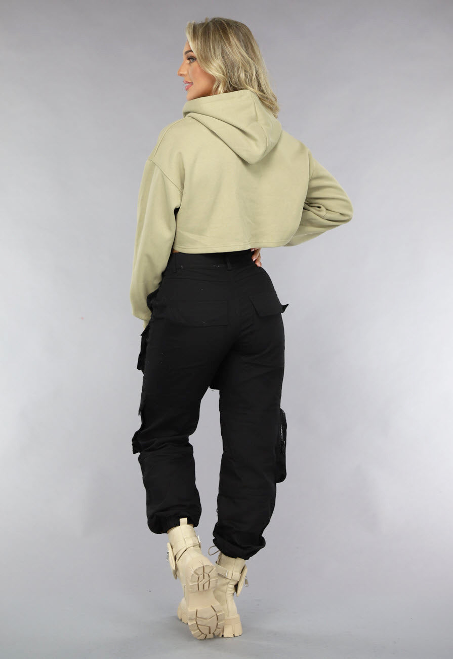 NEW0811 Khaki Cropped Hoodie met Pofmouwen Maat S