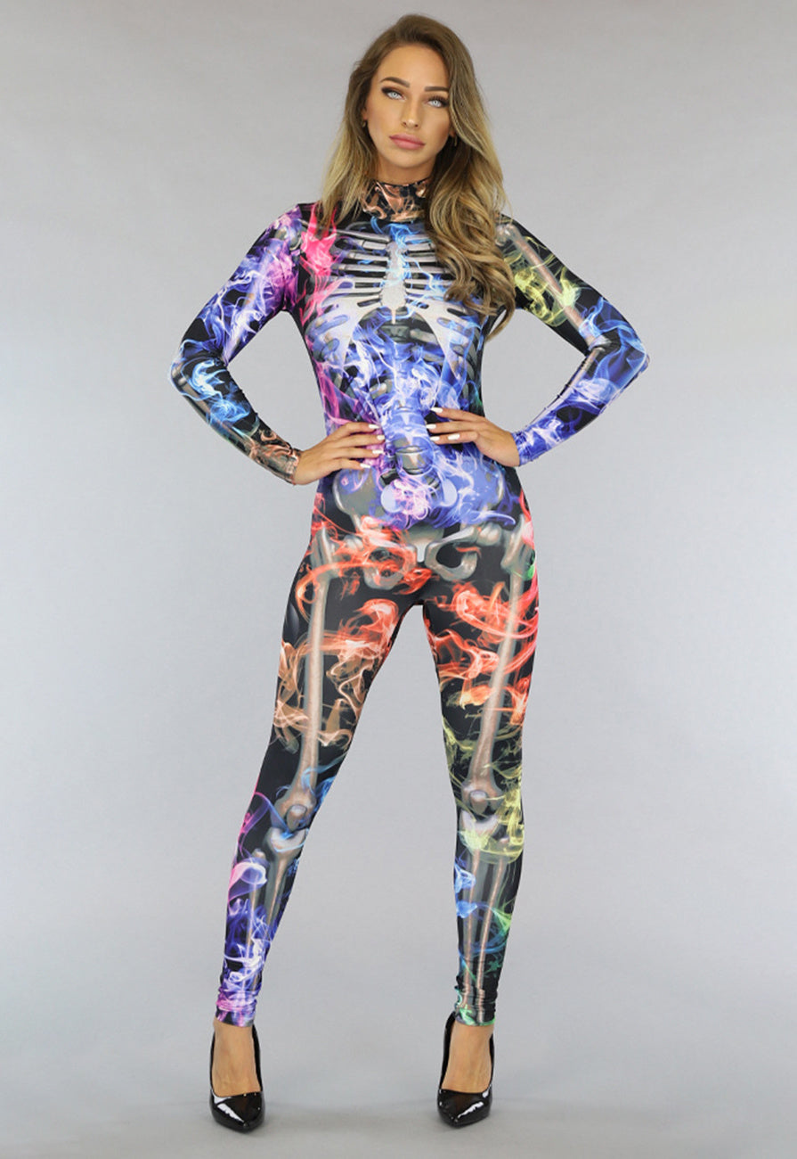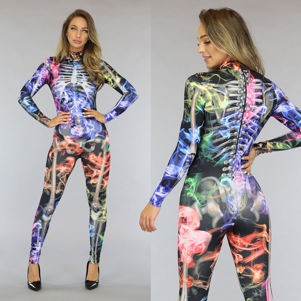 Deze mooie jumpsuit is gemaakt van elastische stof en heeft veel stretch. De jumpsuit heeft een hoge kraag met een ritssluiting aan de achterzijde en lange mouwen. De jumpsuit is voorzien van een skelet print en is ideaal voor een Halloweenfeestje of speciale gelegenheden!