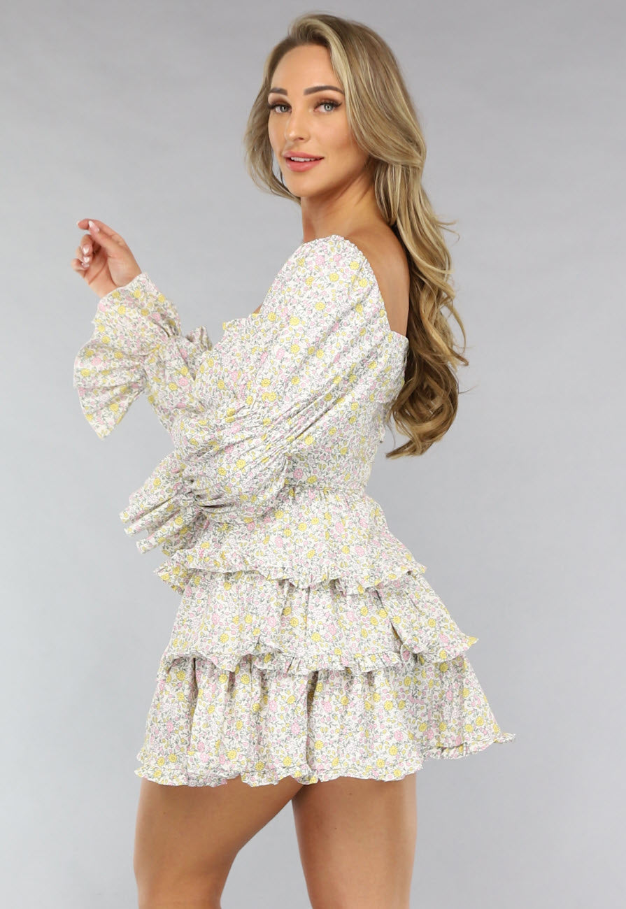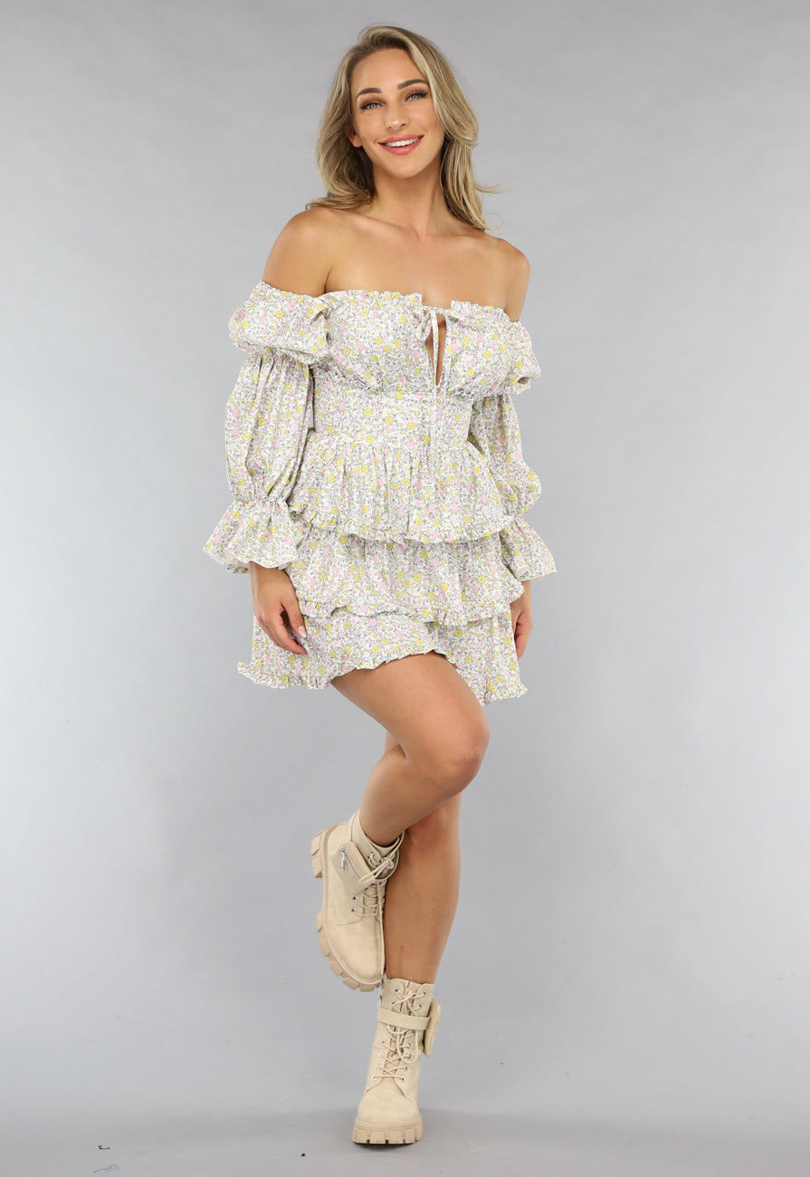 Dit jurkje is gemaakt van een stevige bloemenprint stof. De jurk heeft lange pofmouwen welke off shoulder, maar ook normaal te dragen zijn. Bovenaan de jurk zit een strikdetail en de rok van de jurk is gelaagd waardoor hij een leuk skater effect krijgt. Door middel van de blinde ritssluiting aan de achterkant kun je hem gemakkelijk aan trekken.