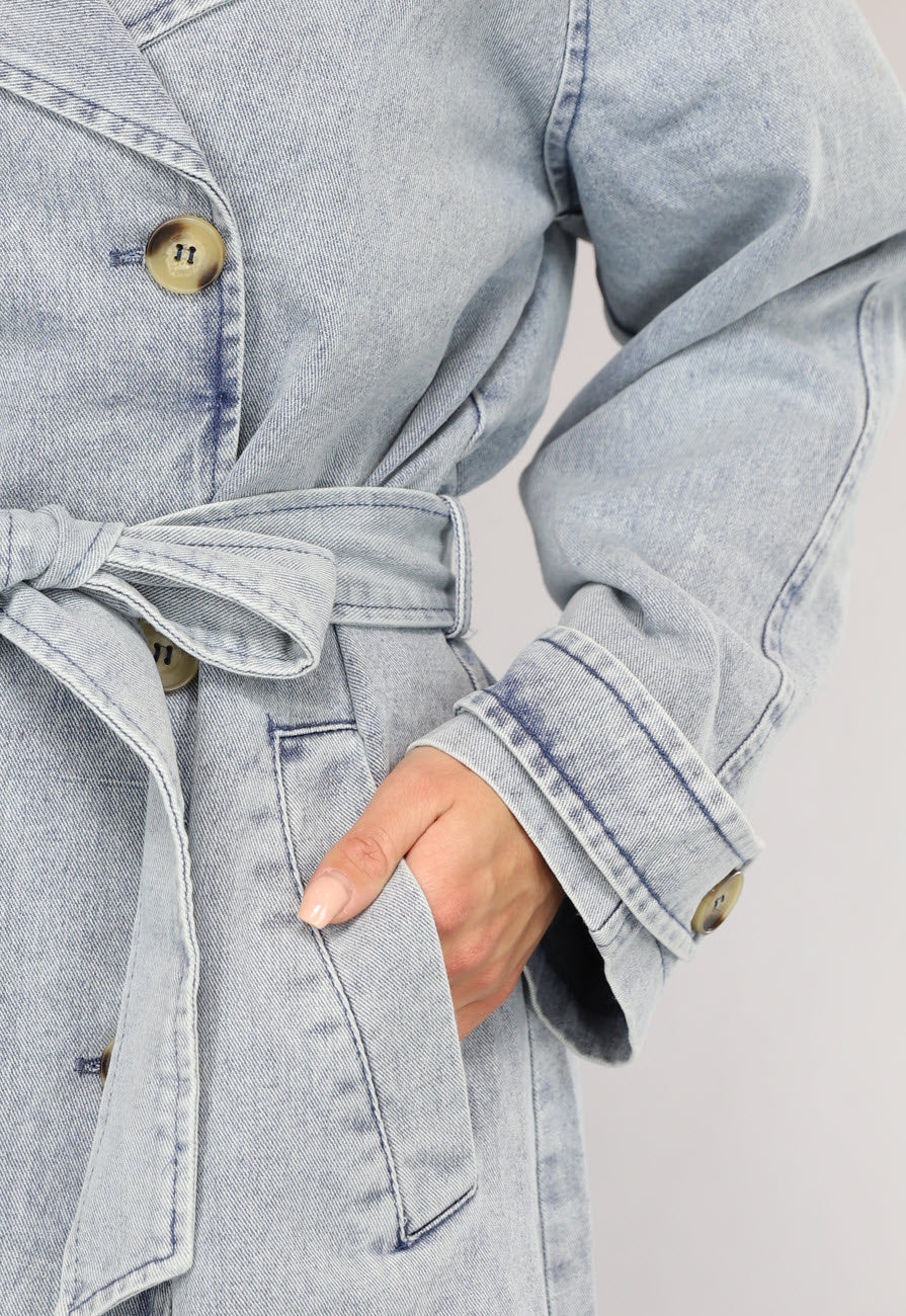 Deze lange jas is gemaakt van een stevige denim stof en is erg leuk om zowel open als dicht te dragen! Hij heeft een brede kraag en lange mouwen. De jas heeft drie knopen aan elke kant waarmee je de jas kunt sluiten. Aan het uiteinde van de mouwen zitten kleine riempjes met knopen en boven op de schouders zit ook een riempje met een knoop, deze kan ook los. In de taille zit aan elke zijde lusjes waar je eventueel de meegeleverde tailleband doorheen kan halen. Deze band kan je op verschillende manieren rond je middel knopen/strikken. Hij heeft twee steekzakken en valt tot net over de knie.