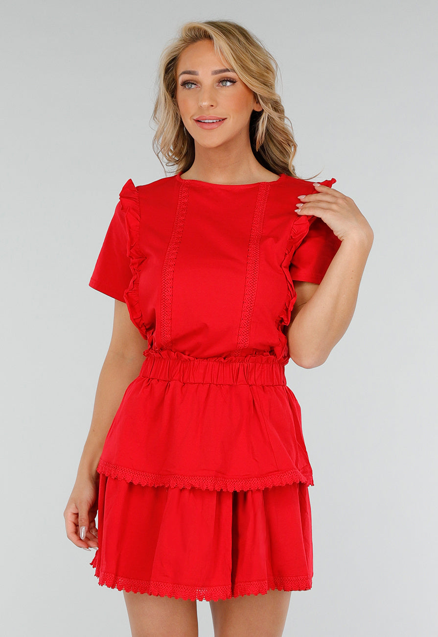 Deze rode two piece set bestaat uit een losvallende top met korte mouwen en een bijpassende rok. De top heeft een ronde halslijn, decoratieve ajourbiezen en ruches langs de voorzijde. De rok is gelaagd met twee rucheranden met gehaakte details en voorzien van een elastische tailleband met ruffle. Beide delen zijn gemaakt van een stretch stof met lichte structuur. De rok valt boven de knie en heeft een uitlopende pasvorm.