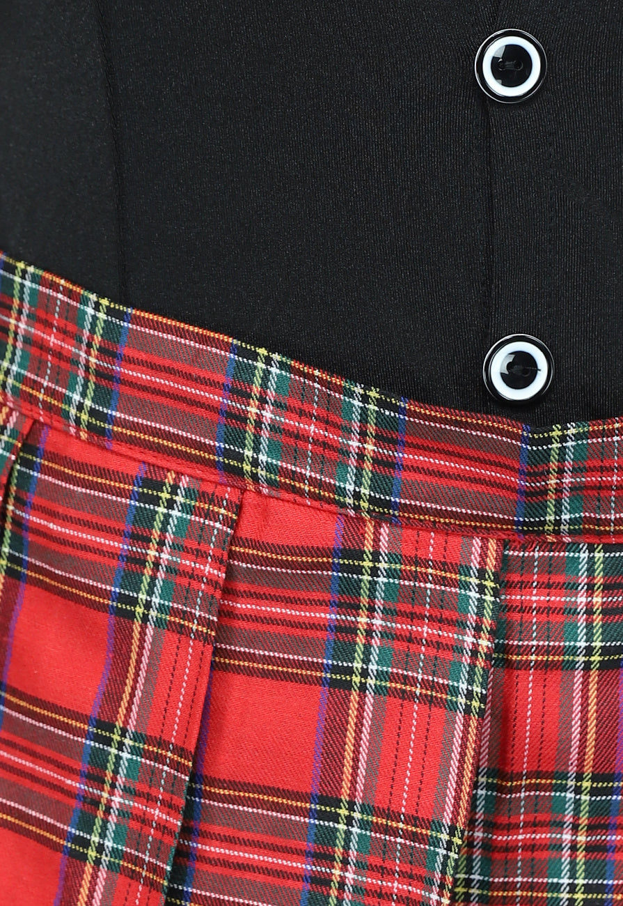 Deze speelse lingerie set is voorzien van een zwarte top welke vaste jarretels bevat. De top heeft bij de borst een geruit detail welke afgewerkt is met een kanten randje. De top is ook voorzien van knopen, maar deze hoeven niet als sluiting gebruikt te worden, omdat de top onwijs veel stretch bevat. In dezelfde geruite stof wordt ook het geplooide skater rokje bijgeleverd welke je over de top kan dragen. Doordat je de rok eroverheen draagt komen de jarretels speels onder het rokje vandaan. Deze kan je uiteraard vastmaken aan je eigen kousen. Om deze speelse set af te maken worden er mesh handschoentjes bijgeleverd. De geruite stof komt als laatst ook nog terug in de bijgeleverde manchetten.