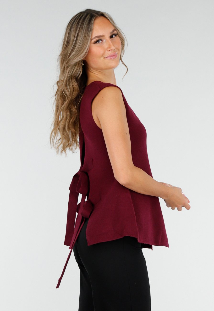 Deze mouwloze top is uitgevoerd in een diepe bordeauxkleur en gemaakt van een stevig, licht rekbaar materiaal met een gladde structuur. De voorkant is voorzien van een V-hals en sluit met een rij verschillende en sierlijke goudkleurige knopen. Aan de achterzijde is het model voorzien van twee brede striklinten op de rug. De top valt recht langs het lichaam en loopt licht uit aan de onderzijde.