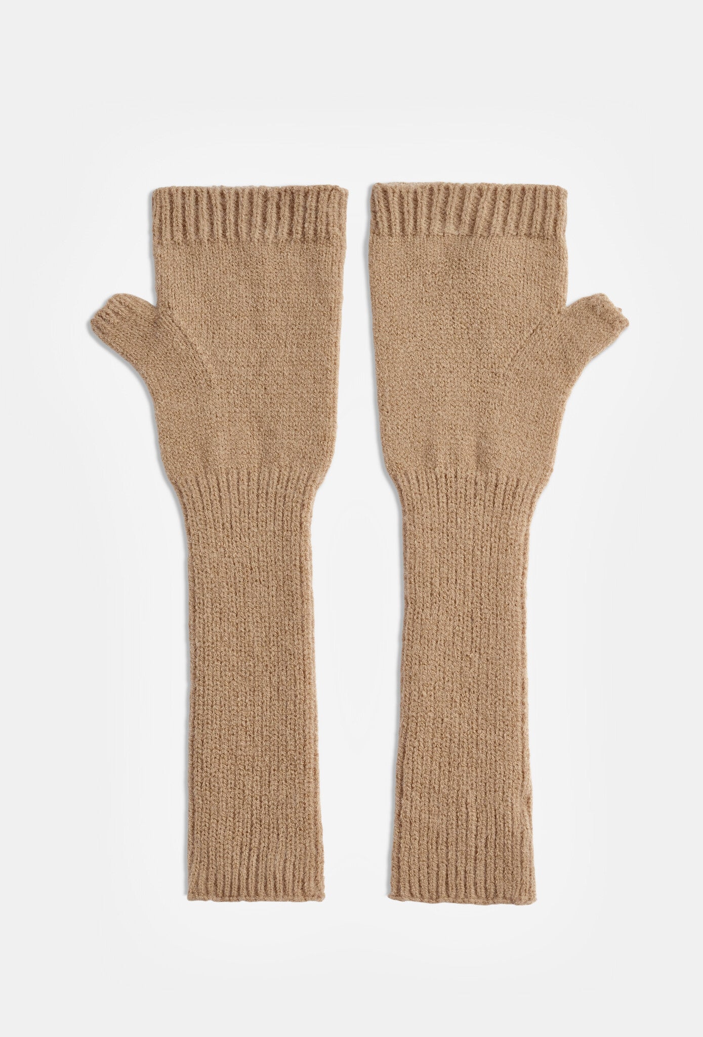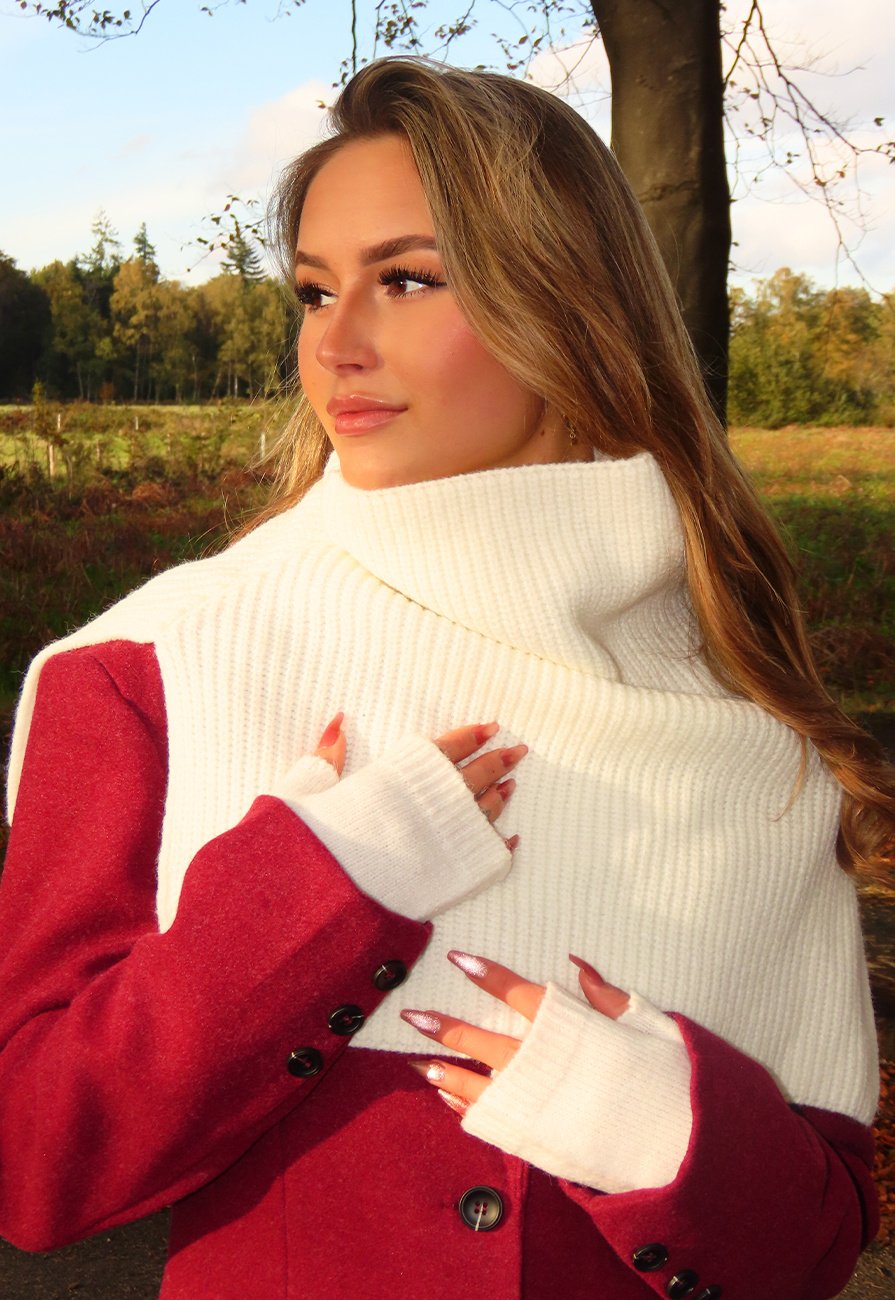 Deze gebreide handschoenen zijn uitgevoerd zonder vingertoppen, waardoor de vingers vrij blijven. Het model heeft een geribde structuur en loopt lang door tot voorbij de pols voor extra warmte. De handschoenen zijn volledig in wit uitgevoerd en sluiten zacht om de handen door het rekbare breisel. Dankzij het open vingermodel zijn ze praktisch voor dagelijks gebruik waarbij handigheid behouden blijft.