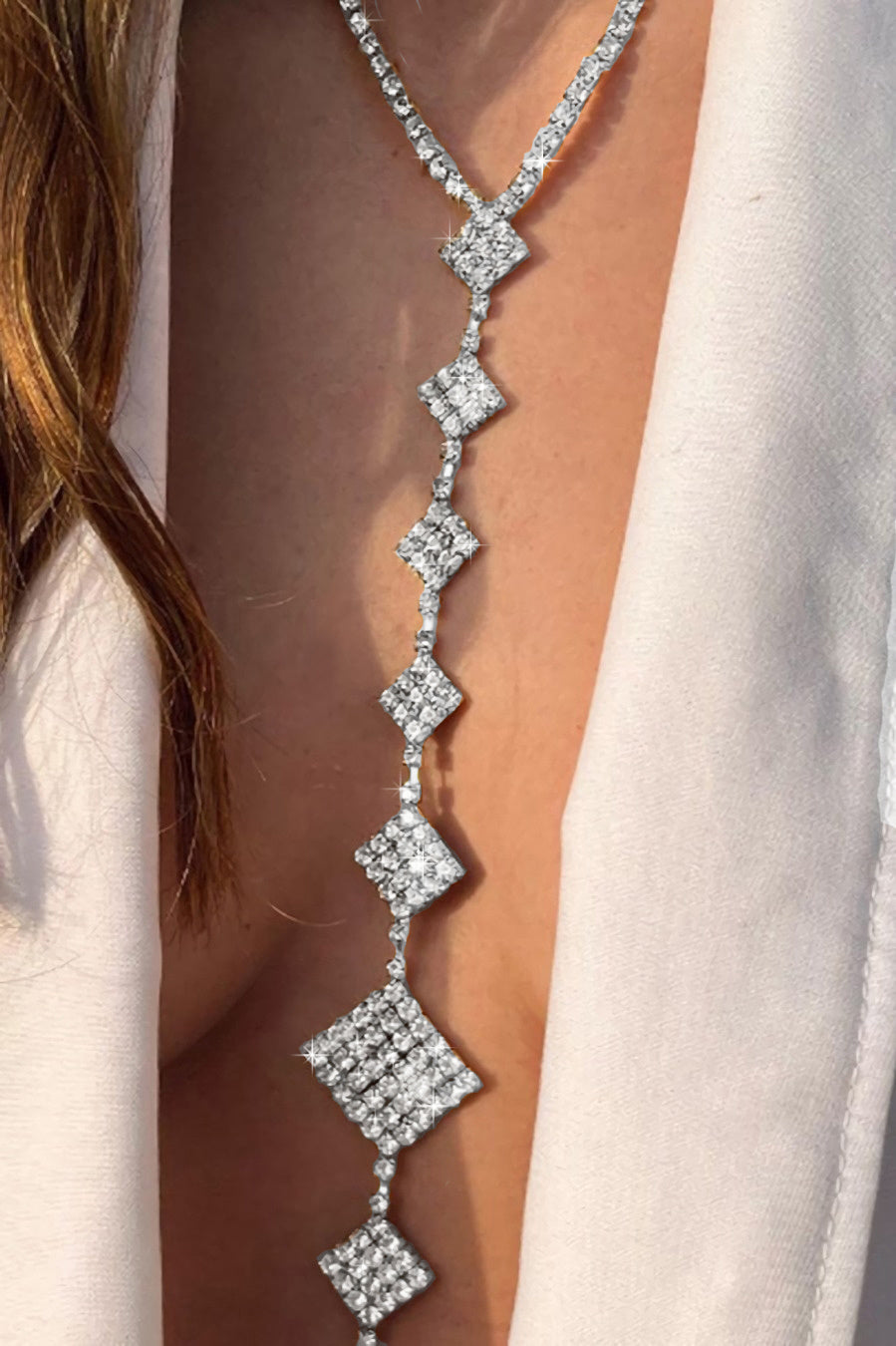 Deze bodychain is perfect voor als je een diep decolleté hebt en een speciaal evenement hebt. De ketting is voorzien van vierkantjes met glittersteentjes. De vierkanten zitten in het midden van de borst en loopt naar de nek en onder de borst. De bodychain is voorzien van twee karabijnsluitingen.