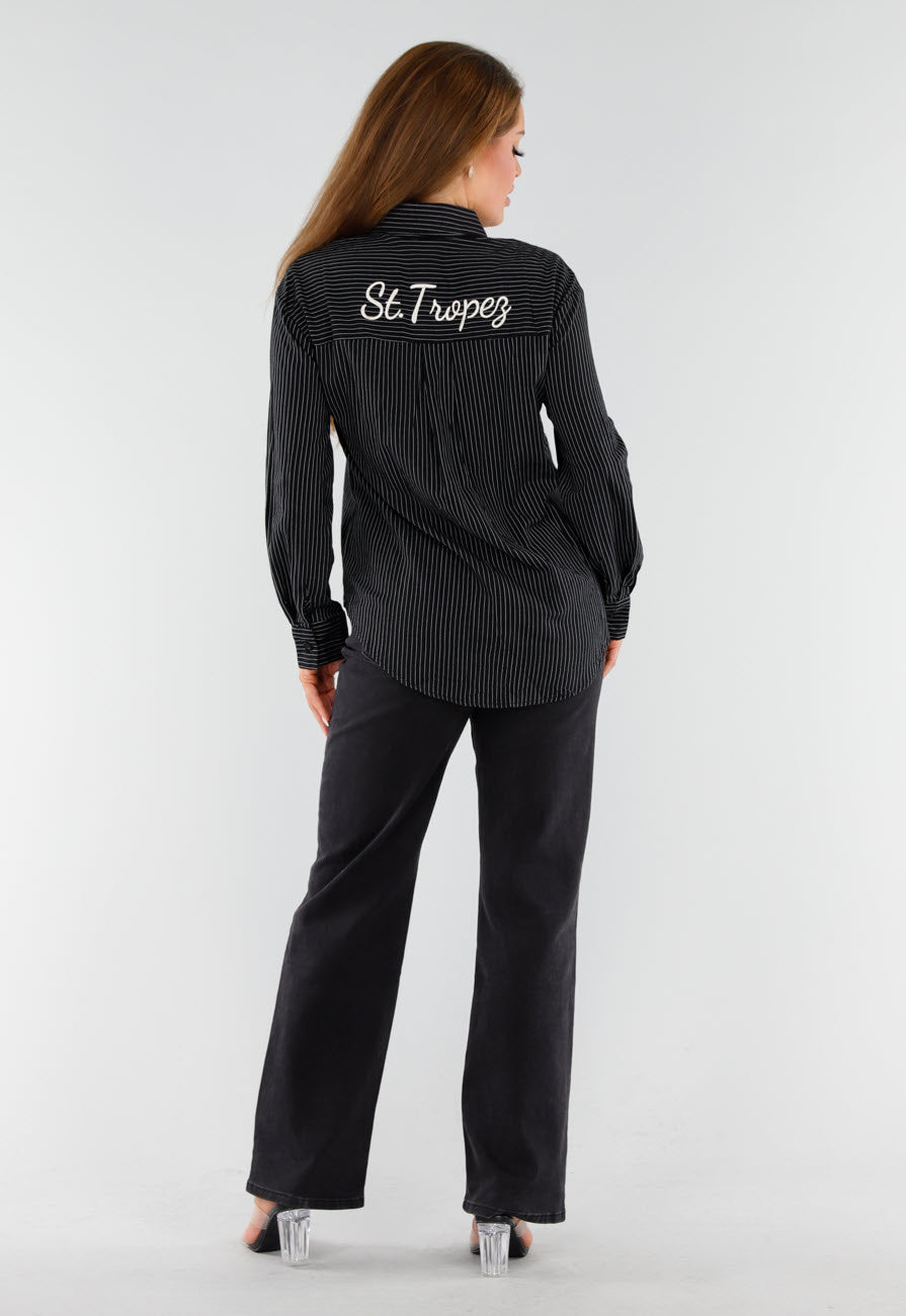 Deze Zwarte blouse is voorzien van een fijn verticaal krijtstreep patroon in wit. Op de achterkant staat een geborduurd “St. Tropez” detail net onder de schouder, in wit contrastgaren. De blouse heeft een kraag, knoopsluiting aan de voorkant en lange mouwen met knoopmanchetten. De onderzijde is afgerond en valt over de heup. De stof heeft een licht glanzende afwerking en voelt soepel aan.