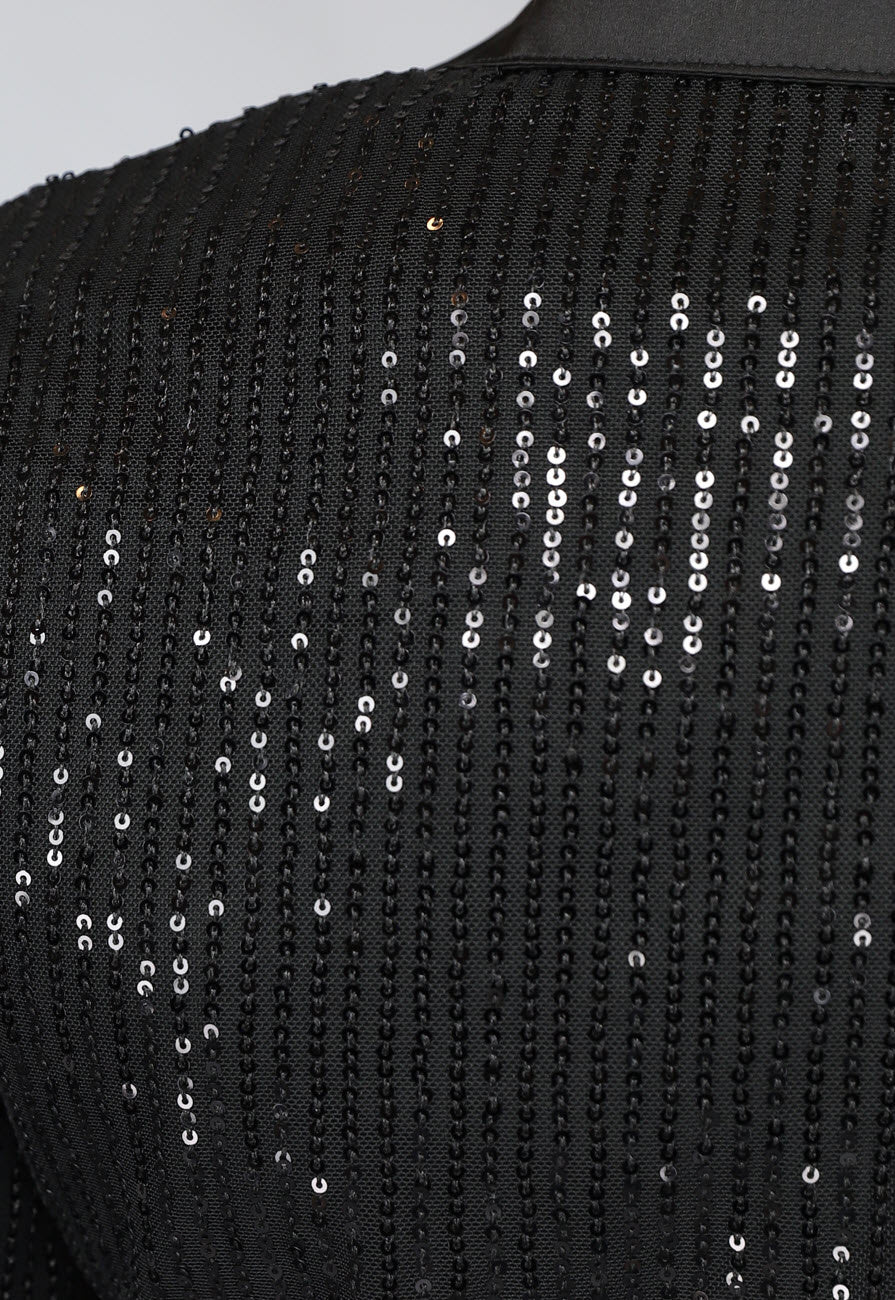 Deze party blouse is volledig bedekt in pailletten, daarom is hij perfect voor speciale gelegenheden! De hals van de blouse is voorzien van een kraagje, verder valt deze in een v hals naar beneden. De blouse heeft lange mouwen en valt cropped. De blouse heeft een overslag model en bevat twee knoopjes om hem te sluiten, aan de binnenkant zit nog een extra knoopje zodat de blouse niet open valt. Deze geweldige top bevat stretch.