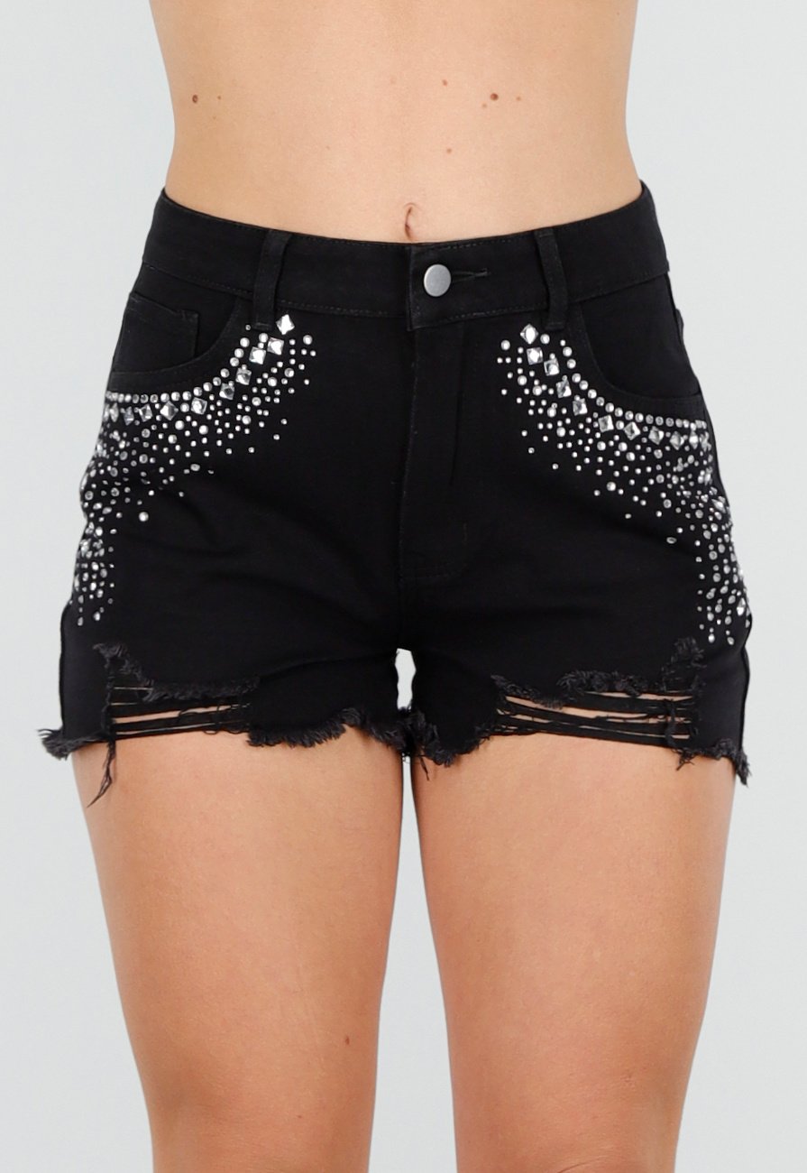 Zwarte Denim Short met Strass Steentjes