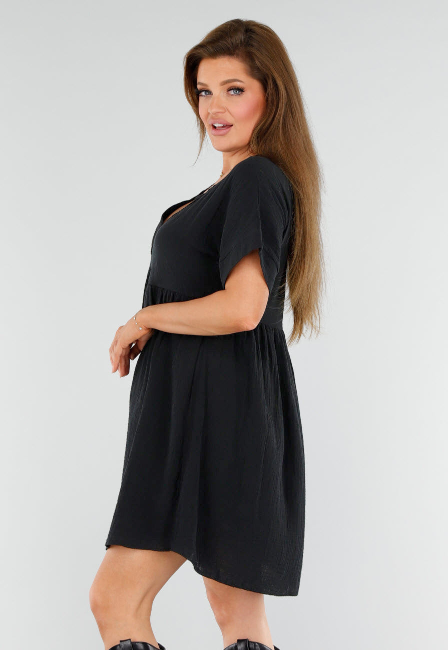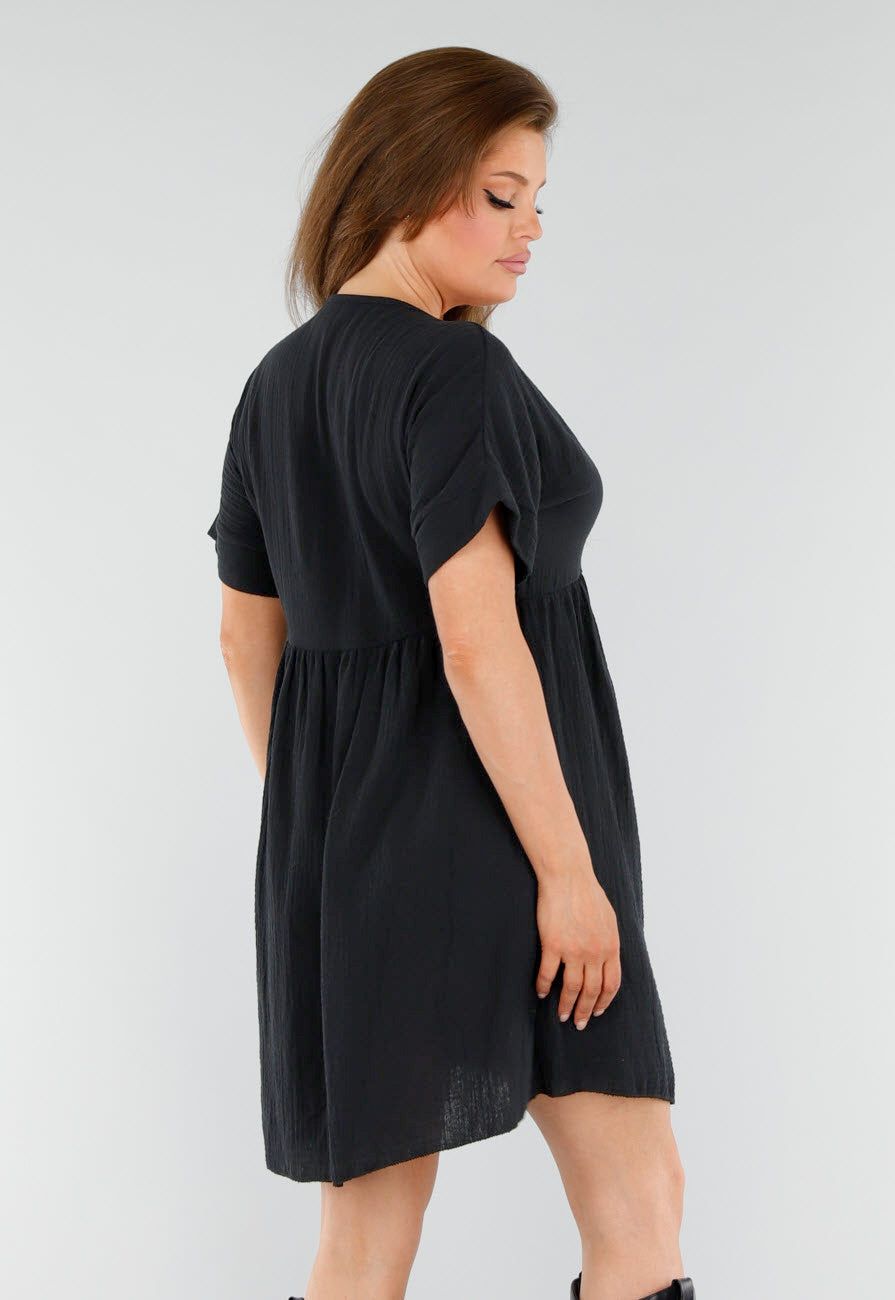 Deze zwarte jurk is gemaakt van luchtige, kreukstructuur stof met een losse pasvorm. De jurk heeft korte mouwen met een hoge boord en een lichte A-lijn fit die naar beneden uitloopt. De V-halslijn is afgewerkt met een fijn borduursel in dezelfde kleur. De taille is verhoogd. De lengte valt tot net boven de knie en de zoomlijn is licht afgerond waardoor de achterkant langer is dan de voorkant.