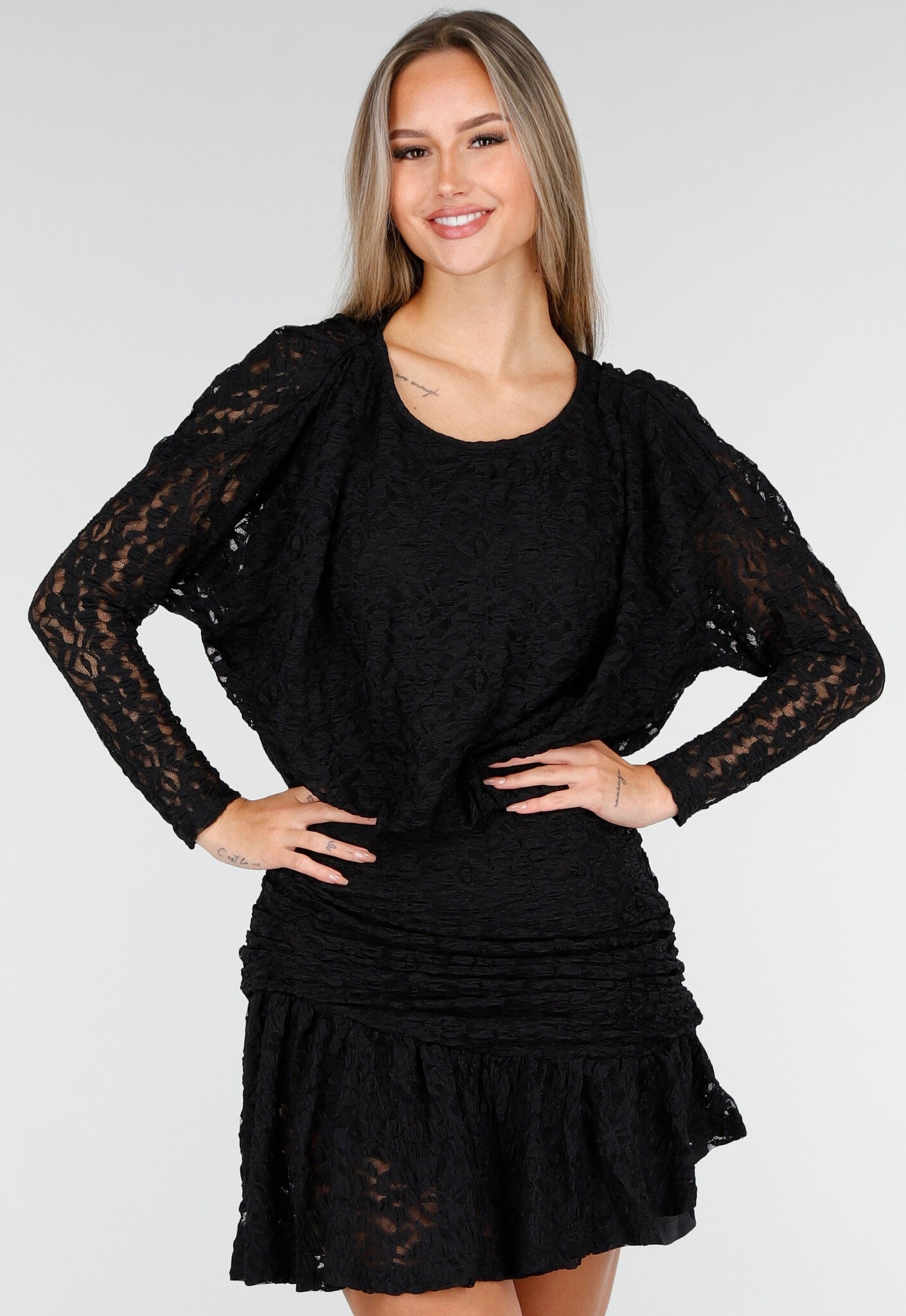 Deze korte jurk is uitgevoerd in zwart kant met een rekbare structuur die de pasvorm flexibel maakt. Het model heeft een ronde halslijn en lange mouwen van doorzichtig kant. De taille en heupzone zijn licht geplooid en sluiten mooi aan door de stretchstof. De rok valt boven de knie en is afgewerkt met een asymmetrische geplooide rand.