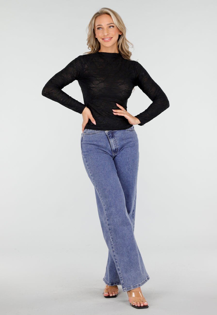 Zwarte kanten top met hoge ronde hals en lange mouwen. De doorschijnende kantstof geeft een elegante en vrouwelijke uitstraling. Dankzij de lichte stretch sluit de top mooi aan op het lichaam.