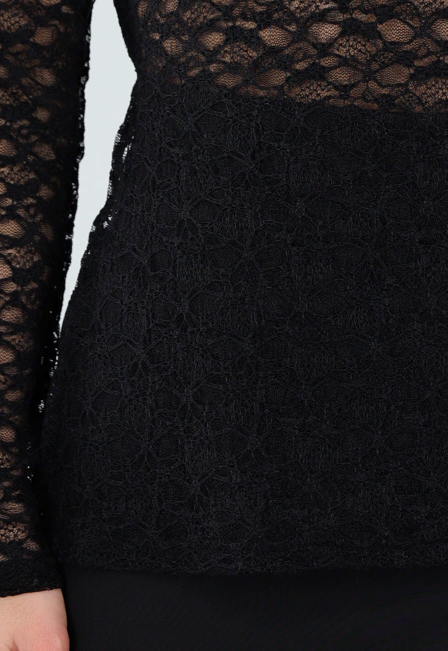 Deze top is uitgevoerd in een zwarte kleur en volledig gemaakt van kant met een open structuur. Het model heeft lange mouwen en een ronde halslijn. Aan de onderzijde is de top voorzien van een split aan de zijkant. De pasvorm is recht en het kantpatroon is gelijkmatig verdeeld over het gehele oppervlak.