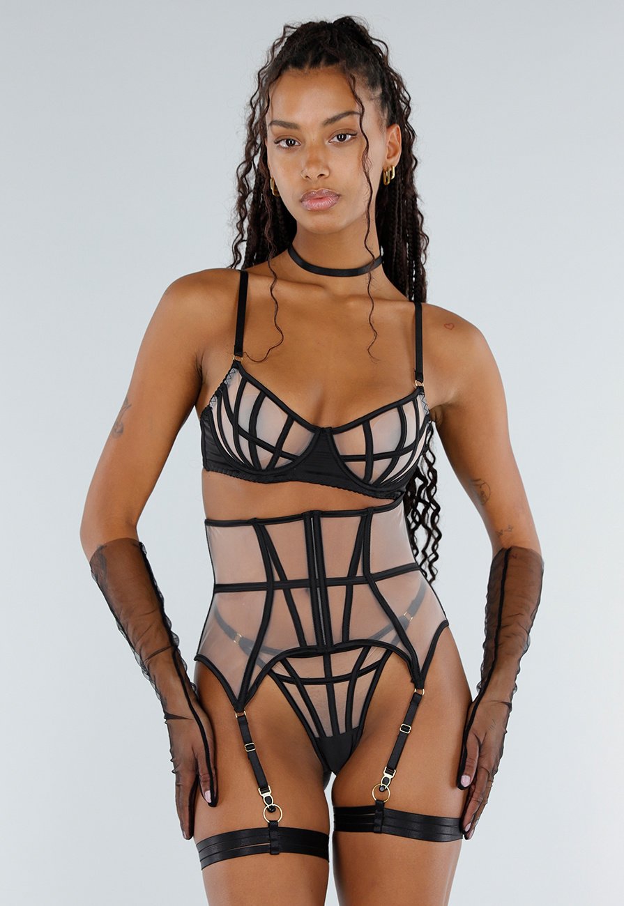 Deze zwarte lingerieset bestaat uit een choker, beugel-BH, hoge taille jarretelgordel, slip en bijpassende mesh handschoenen. De set heeft brede elastische banden die in een strak lijnenpatroon over het transparante materiaal lopen. De bh heeft beugels en verstelbare bandjes voor ondersteuning en pasvorm. De jarretelgordel is voorzien van metalen ringen en afneembare jarretelbandjes met clips. Aan de achterzijde sluit de set met haakjes. De bijpassende choker heeft dezelfde bandstructuur en sluit met een verstelbare gesp.