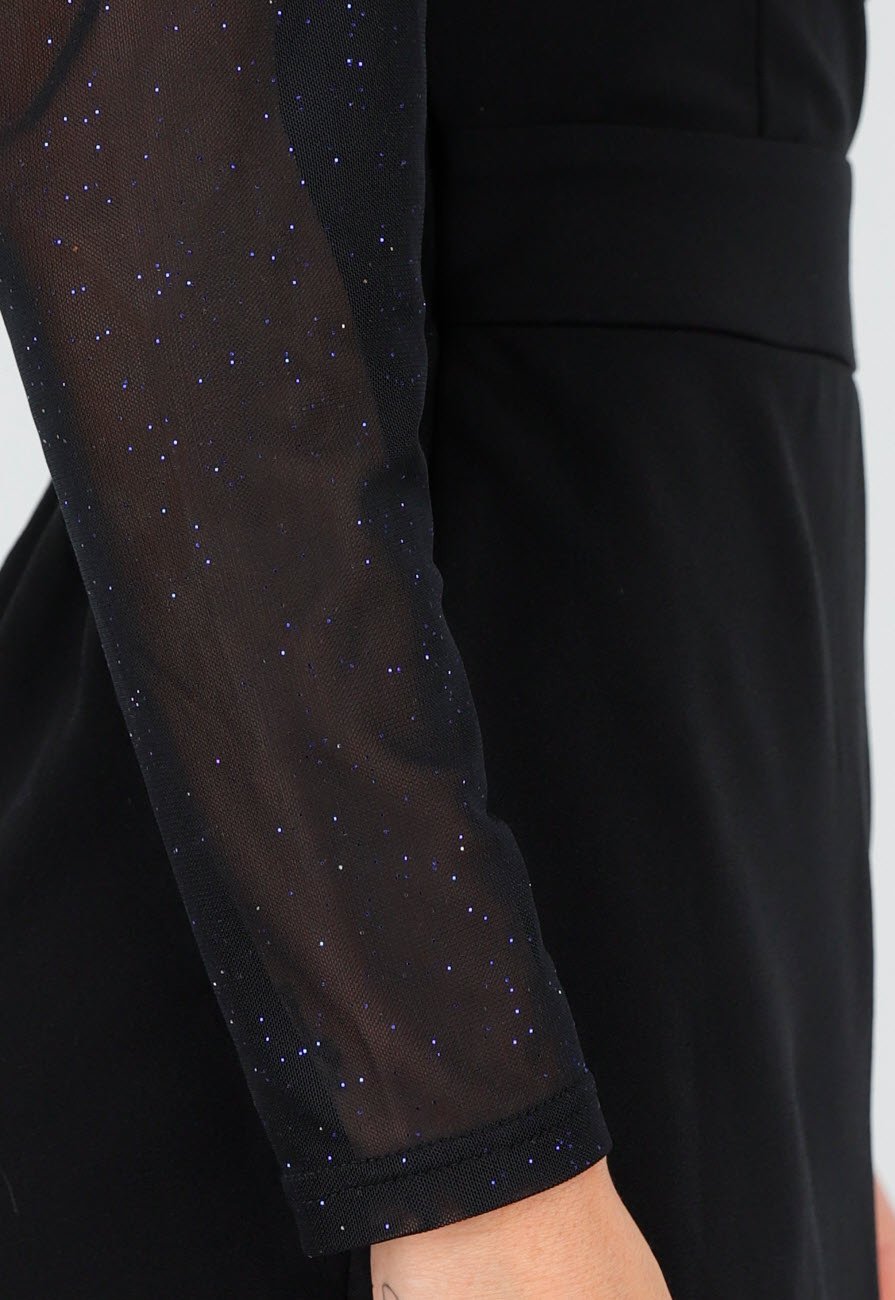 Deze playsuit is gemaakt van zwarte, gladde stof en heeft lange mouwen van transparant mesh met subtiele blauwe glitteraccenten. Het bovenstuk heeft een vaste overslag en een klassieke reverskraag. De taille is elastisch aan de achterzijde en de short valt recht en kort. De mesh mouwen hebben een licht geplooide schouderlijn en een smalle manchetafwerking. De playsuit sluit middels een blinde rits in de zij.