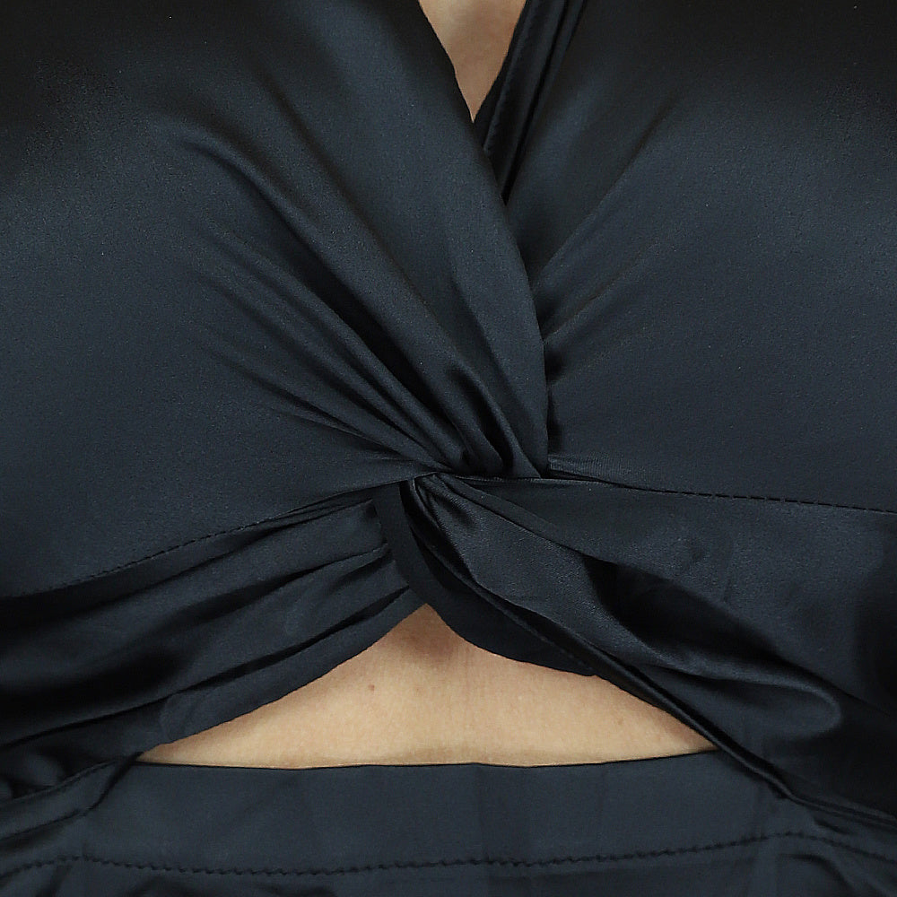 Deze jurk is gemaakt van een mooie satijnen stof. Hij heeft een mooie v-hals boven de buste en tussen de buste een twist detail. De schouders hebben een gepoft detail en de mouwen zijn lang. Onder de buste zit een leuke speelse cut out en de rok van de jurk is aansluitend met geplooide details. De jurk bevat weinig tot geen stretch.