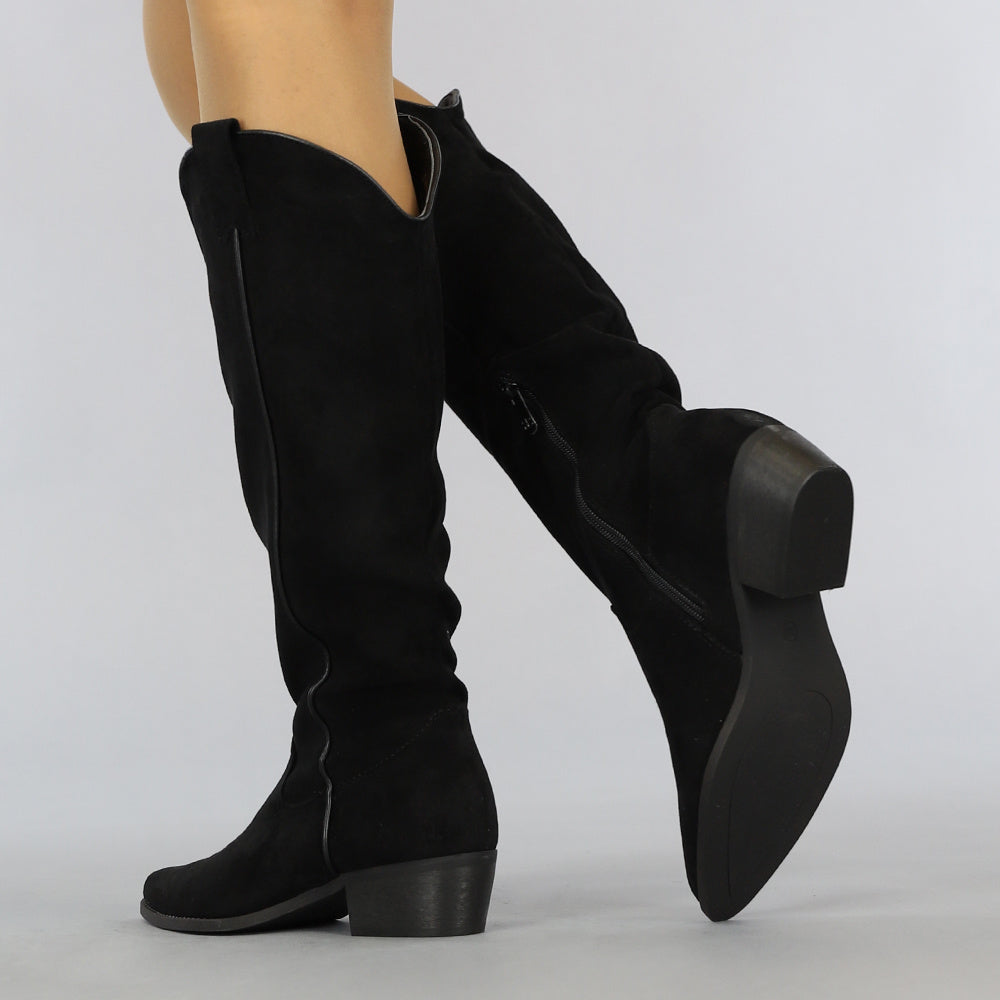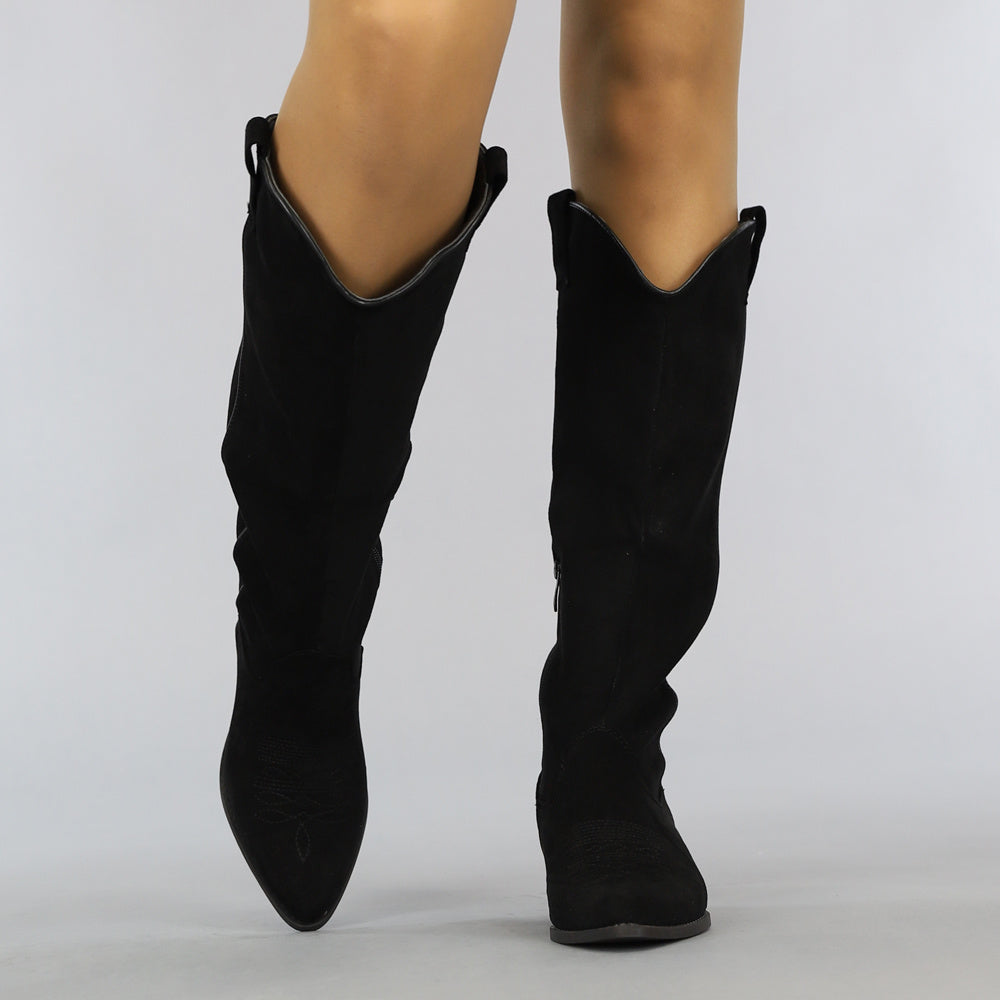 Trefwoorden: suède-look cowboy laarzen, zwarte cowboylaarzen, hoge laarzen, blokhak, spitse neus, ritssluiting
