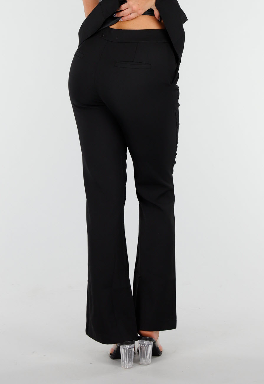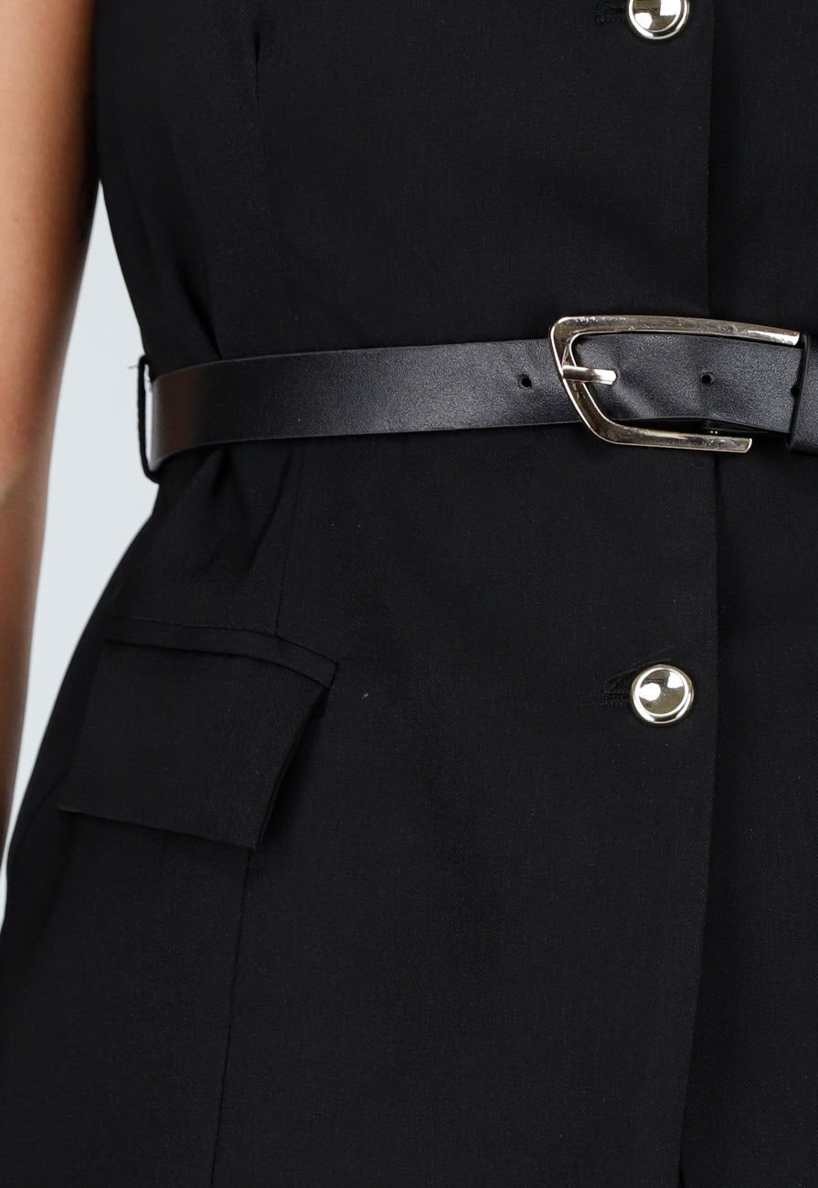 Deze zwarte two piece set bestaat uit een mouwloze top en een bijpassende broek. De top heeft goudkleurige knopen aan de voorkant, een ronde hals en een tailleceintuur met gesp voor een aansluitende pasvorm. De broek heeft flared pijpen met een subtiele persplooi en een gladde afwerking. De stevige stof zorgt voor een elegante vorm die mooi in model blijft.