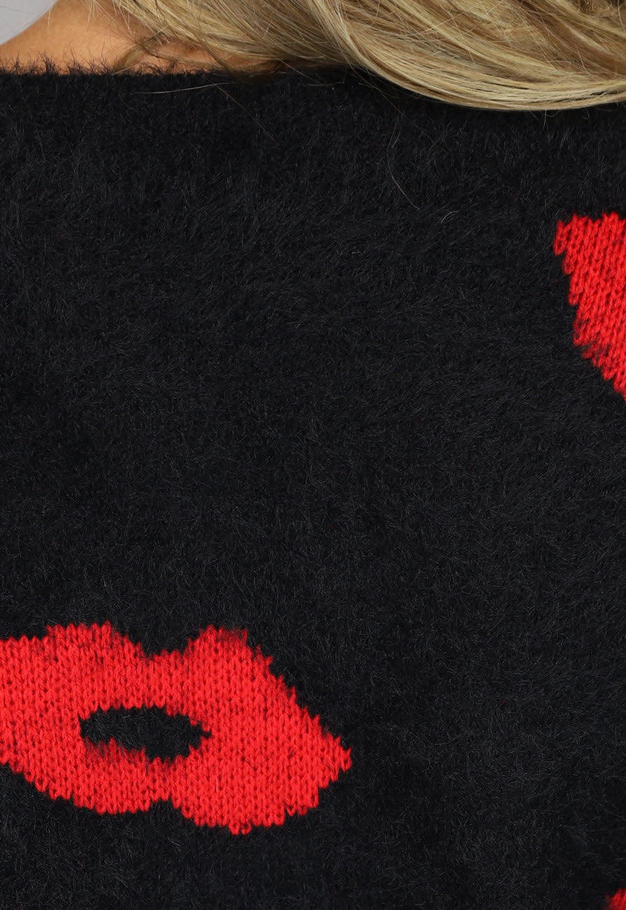 Deze trui heeft een loose-fit model en is gemaakt van een zachte wollen stretch stof waardoor die echt heerlijk zit. Hij heeft lange mouwen en een ronde halslijn. De trui is zwart en is voorzien van grote rode kusjes.
