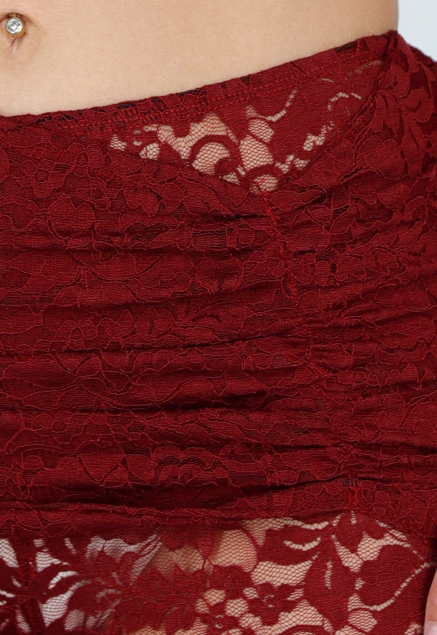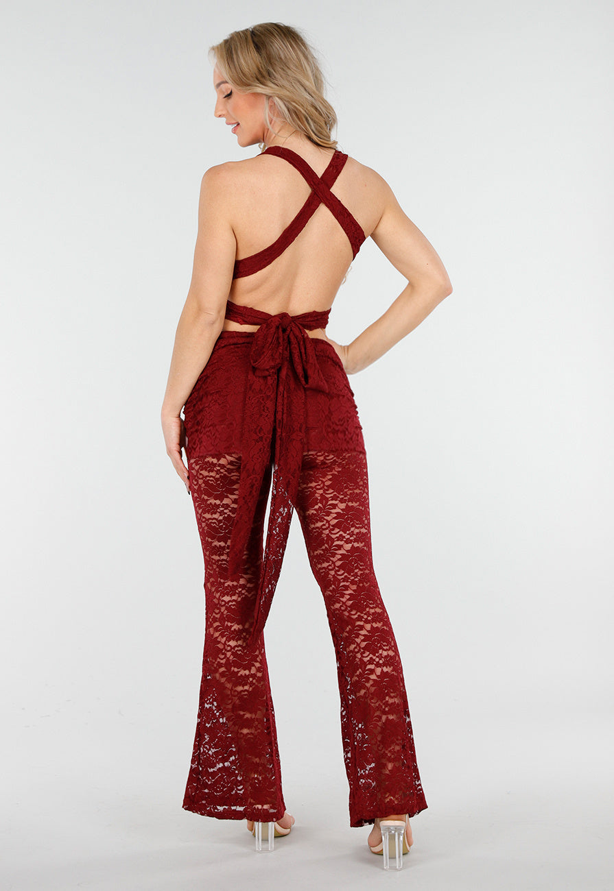 Deze 2-piece set in bordeauxrood bestaat uit een kanten wikkel top zonder mouwen en een flared broek met hoge taille. De top heeft een diepe V-hals en wordt om het lichaam gewikkeld met een gekruiste rug en vastgestrikt aan de zijkant. De broek is volledig transparant en gemaakt van stretchkant met bloemenpatroon, sluit nauw aan rond de heupen en loopt wijd uit vanaf de knieën. De tailleband is elastisch zonder sluiting. De set bevat geen voering, wat zorgt voor een doorschijnend effect over het gehele oppervlak, wel heeft de broek een extra overslaglaag wat voor een deelse bedekking zorgt.