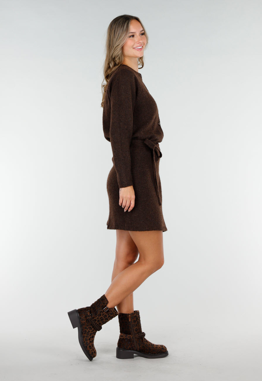 Deze bruine rok is gemaakt van een zachte stretchy gebreide stof. Het model heeft een overslag aan de voorkant die sluit met een strikkoord aan de zijkant. De rok valt kort boven de knie en heeft een rechtvallende achterkant. Dankzij de gebreide structuur draagt de rok comfortabel en blijft de pasvorm mooi aansluiten.