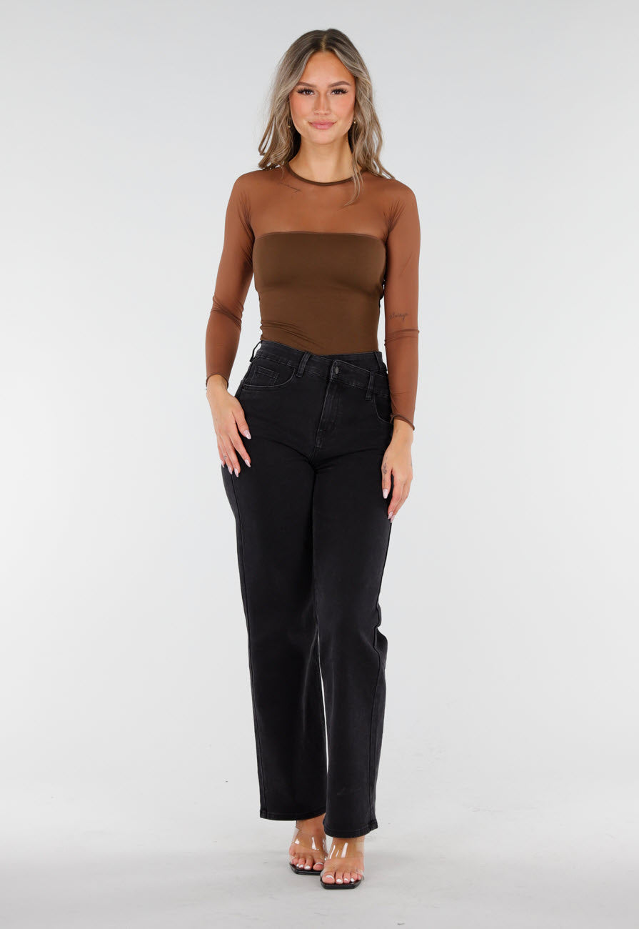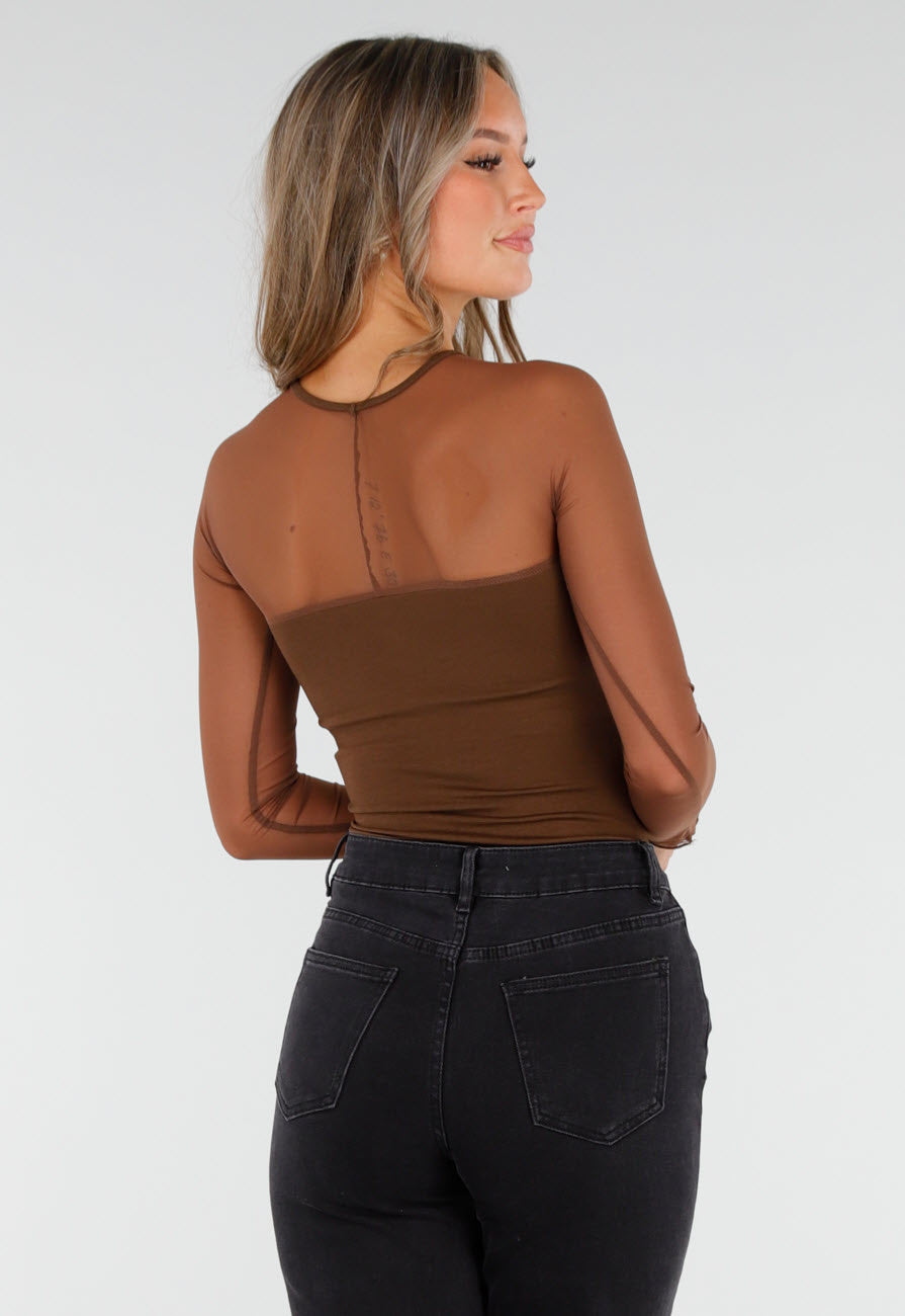 Deze top is uitgevoerd in een bruine stretchstof met een semi-transparant mesh bovenstuk en lange mouwen. Het lijfje is voorzien van geïntegreerde pads en volledig gevoerd. De ronde halslijn en aangesloten pasvorm zorgen voor een strakke look. De meshmouwen en het rugpand zijn transparant, terwijl de rest van de top dicht is afgewerkt. De stof is glad en licht glanzend.