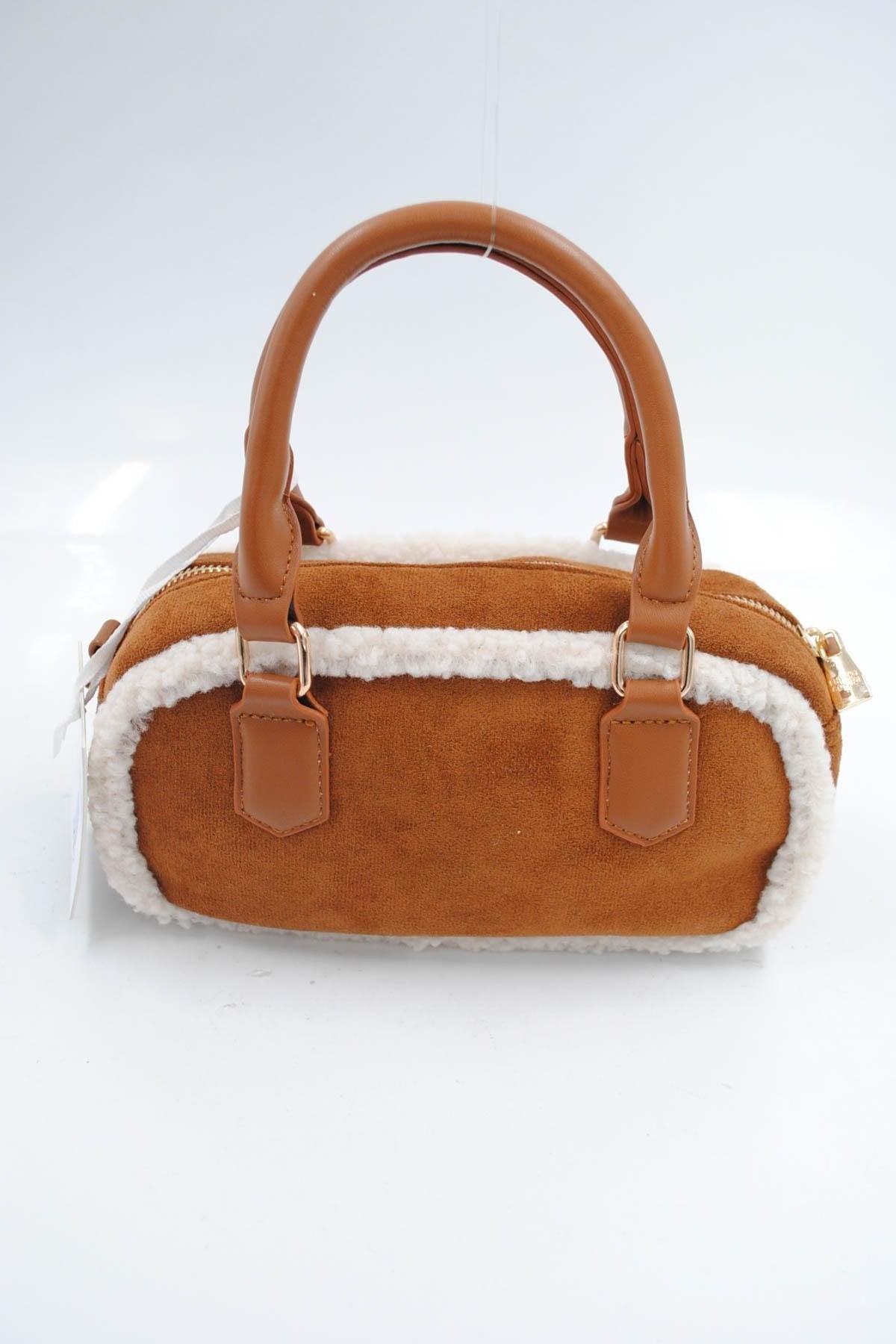 Deze camelkleurige handtas is gemaakt van suède en afgewerkt met een witte teddy bontbies langs de randen. Het ontwerp beschikt over twee stevige handgrepen in bruin kunstleer en een afneembaar, extra lang schouderhengsel, zodat de tas zowel in de hand als crossbody gedragen kan worden. De bovenzijde is voorzien van een goudkleurige ritssluiting en goudkleurige ringen. Dankzij de compacte vorm is de tas perfect voor jouw daily essentials.