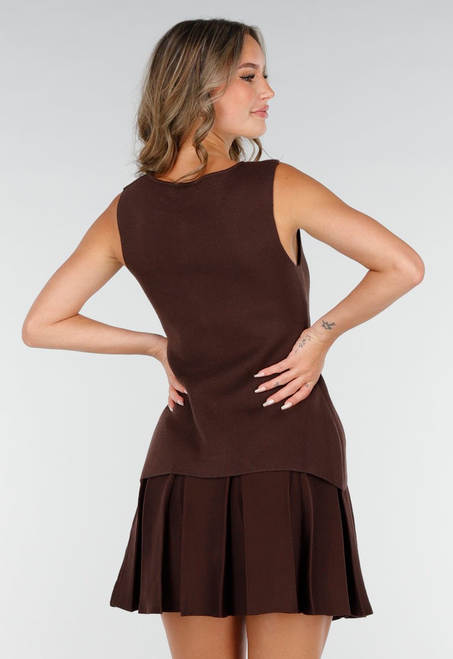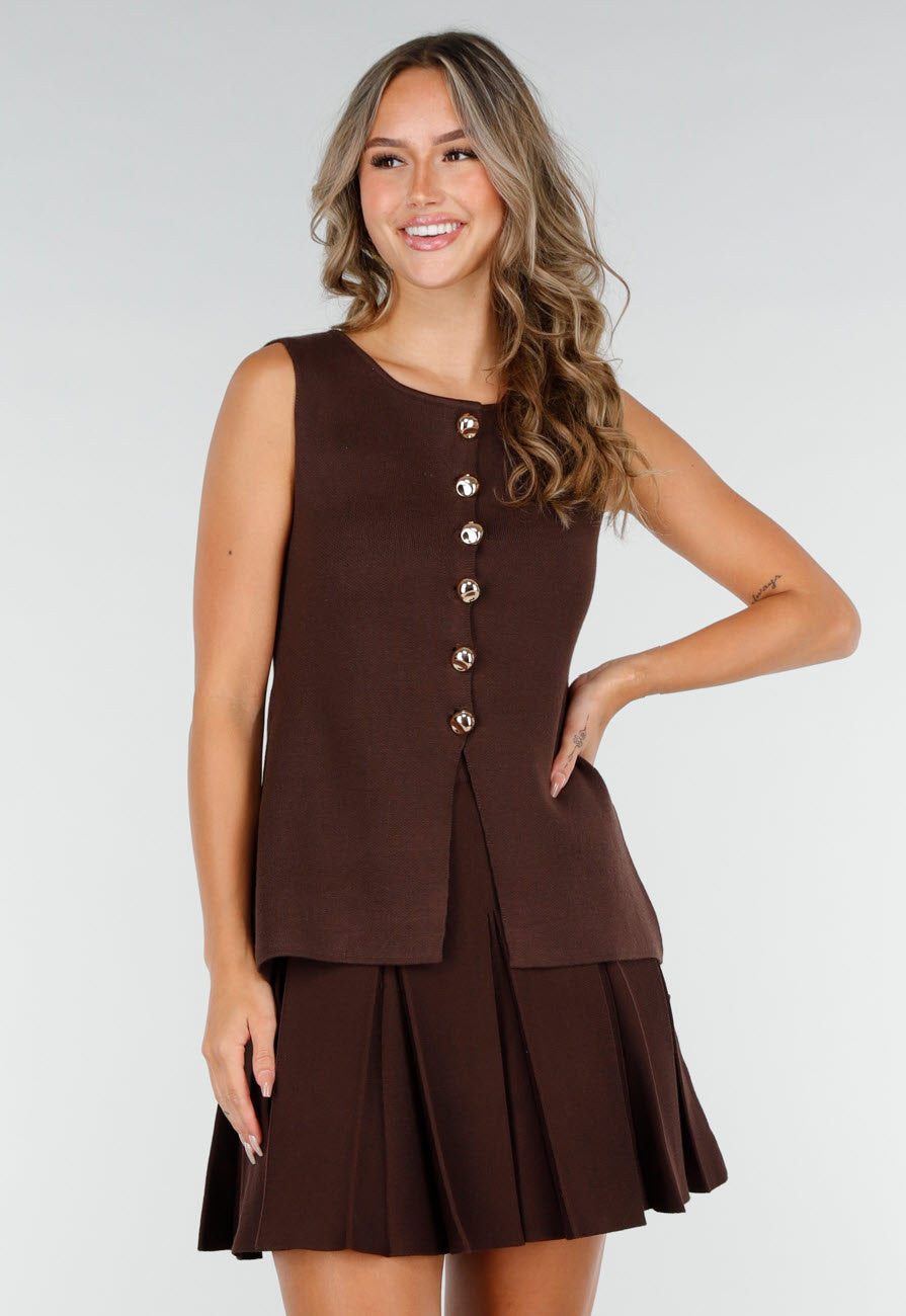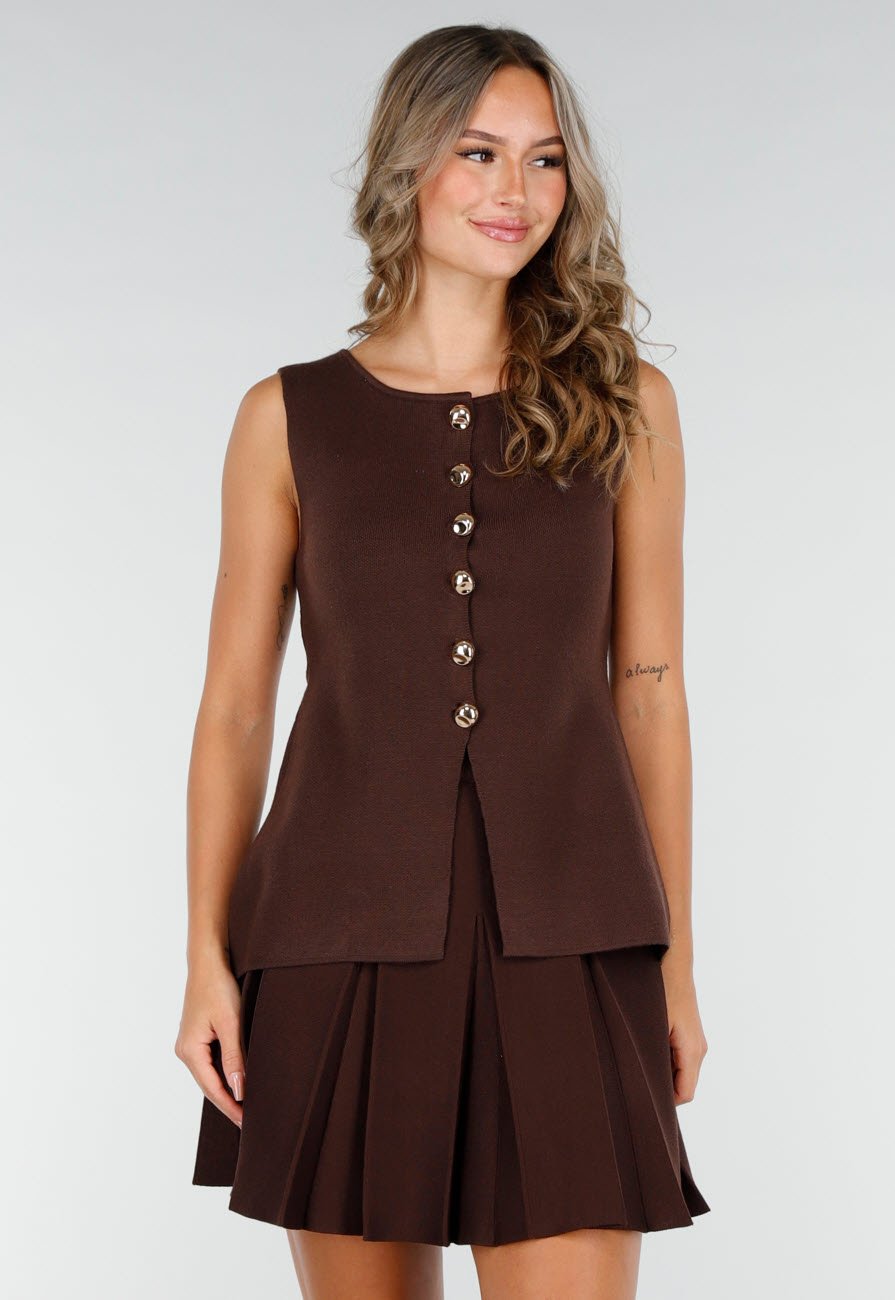 Deze top is uitgevoerd in een donkerbruine kleur met een stevige, licht gestructureerde stof. Het model is mouwloos en heeft een rechte voorkant met goudkleurige knopen en een subtiele split onderaan. Deze top is perfect te combineren met het matching rokje.