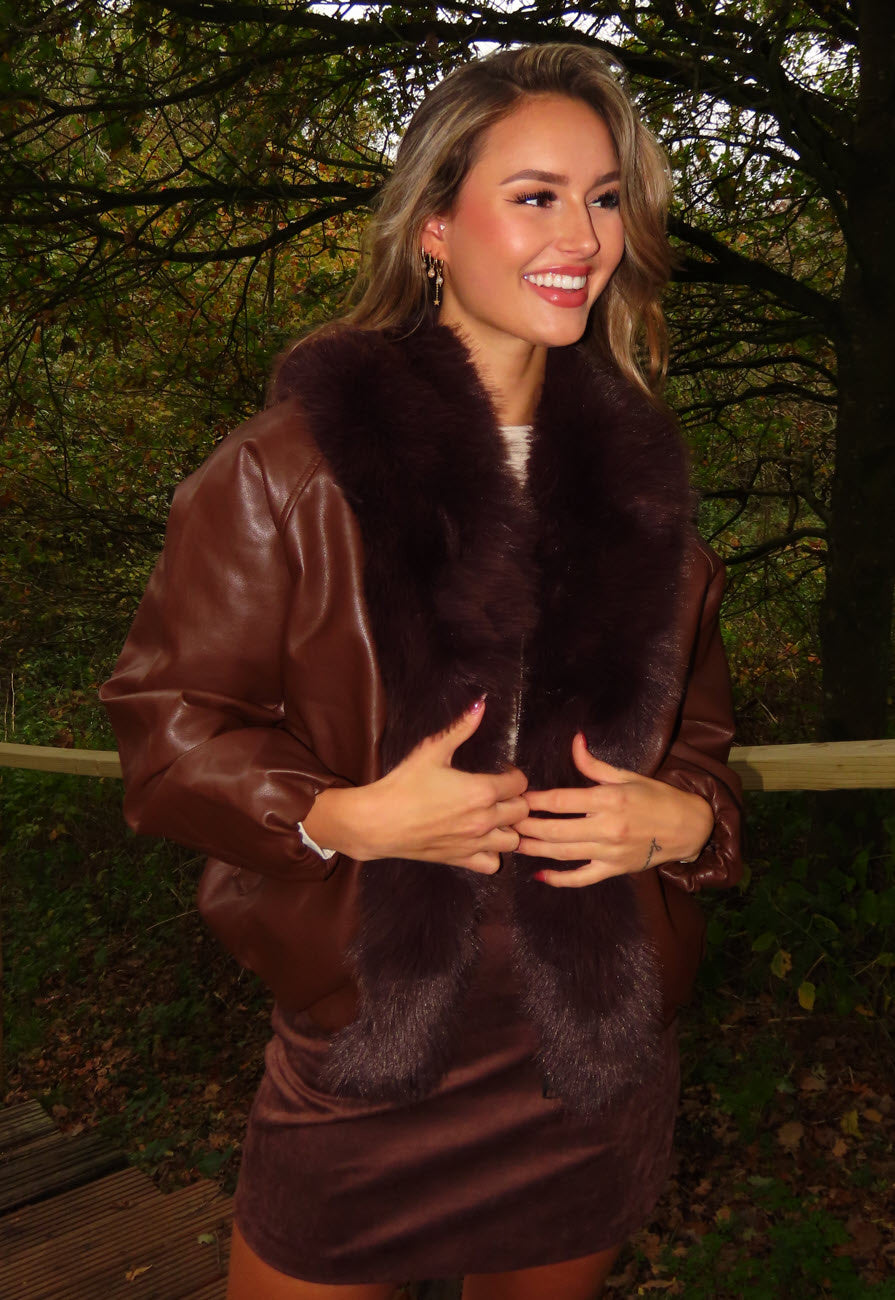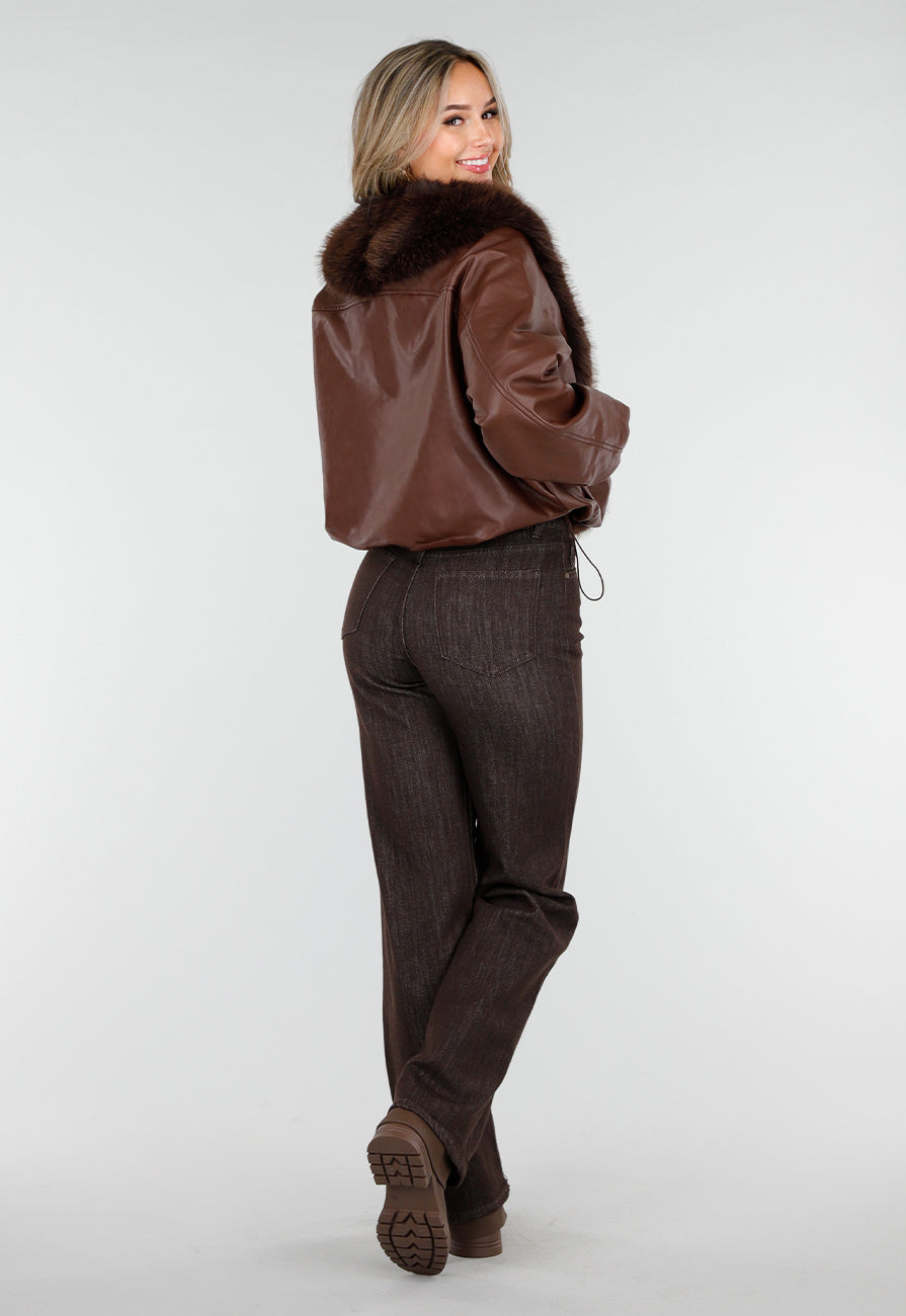 Deze donkerbruine jas is uitgevoerd in een soepele lederlook stof en heeft een royale kraag van imitatiebont in bijpassende tint. Het model heeft verlaagde schoudernaden, een rechte pasvorm en twee steekzakken aan de voorzijde. Aan beide zijkanten zijn verstelbare trekkoorden verwerkt waarmee het model subtiel getailleerd kan worden.