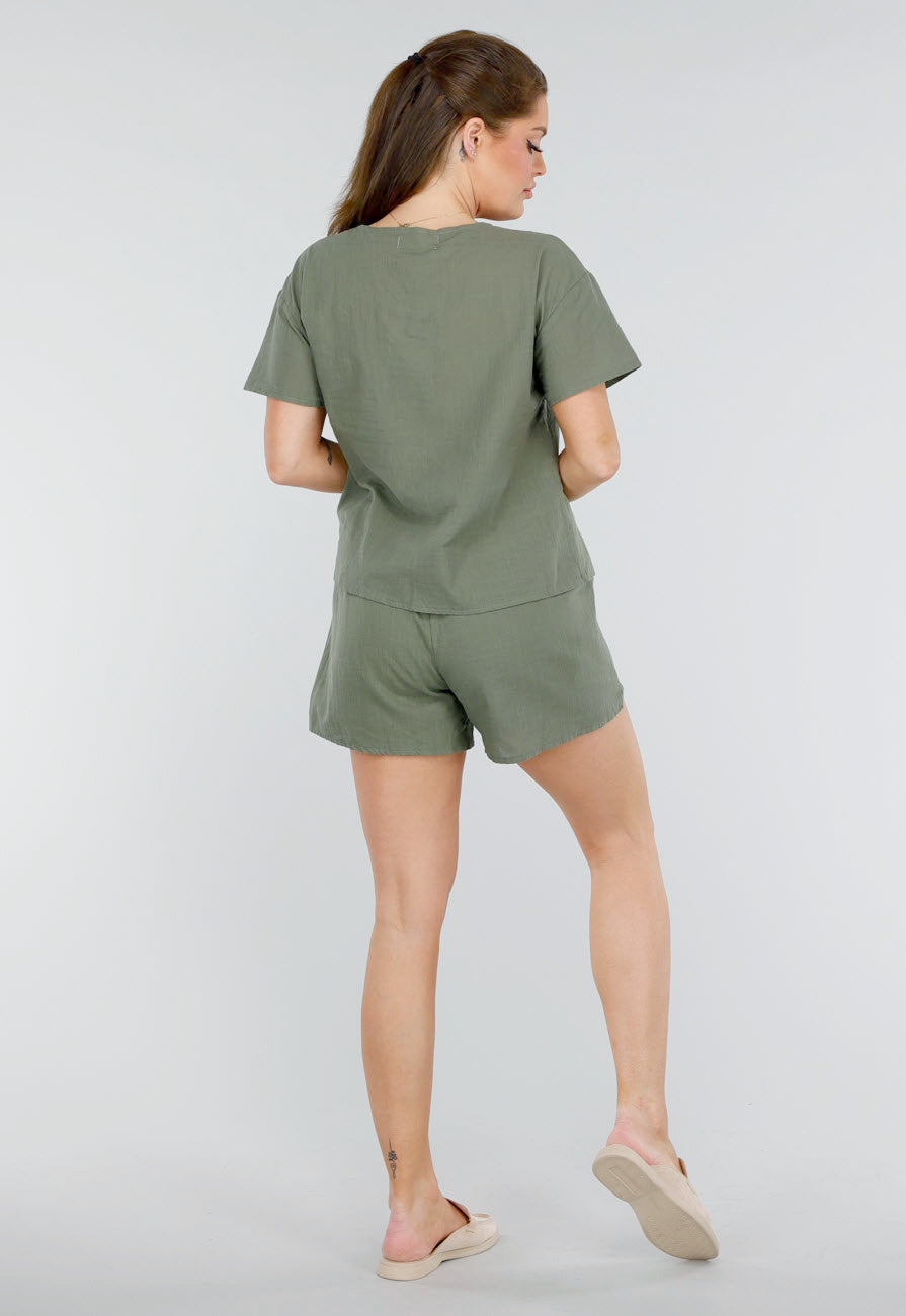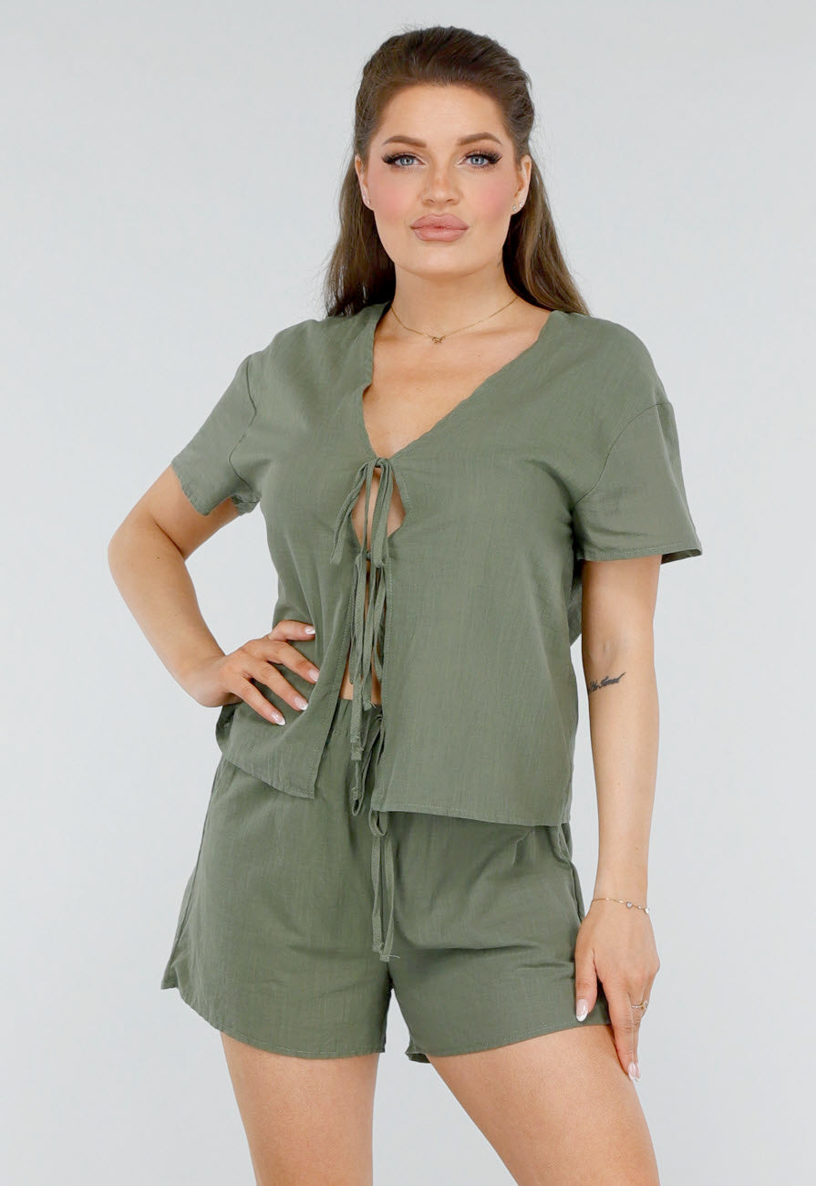 Dit zwart setje, bestaande uit een cropped top en een korte broek, biedt ultiem comfort en stijl. De top heeft een mooie v-hals en een dubbel strikdetail aan de voorkant voor een speelse uitstraling. De korte broek is voorzien van een elastische tailleband, waardoor deze makkelijk aan te trekken is en goed aansluit. De stof is licht en ademend, waardoor het perfect is voor de warmere maanden. De korte mouwen zorgen voor een casual look, terwijl de veelzijdigheid van het setje het geschikt maakt voor verschillende gelegenheden. De combinatie van comfort en een trendy ontwerp maakt dit setje een must-have.