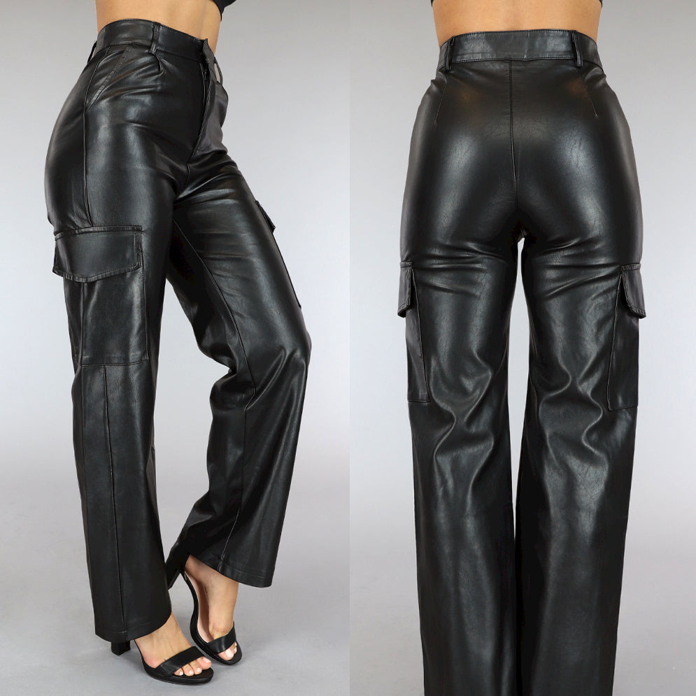 Deze zwarte broek is uitgevoerd in een lederlook materiaal met een subtiele glans. Het model is high waisted en heeft rechte, losvallende pijpen die tot op de enkels reiken. Aan de zijkanten zijn cargozakken met klep verwerkt, wat zorgt voor een utility look. De stof bevat lichte stretch voor extra draagcomfort en sluit met een rits en knoop aan de voorzijde. De broek heeft riemlussen en schuine steekzakken aan de bovenkant.