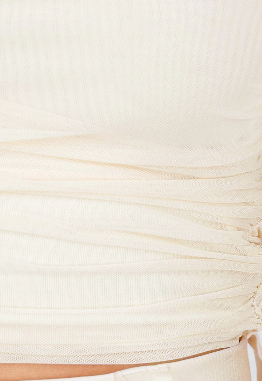 Deze top is uitgevoerd in een lichtbeige gevoerde meshstof met veel stretch. Het model is off shoulder te dragen en heeft een geplooid drapé effect over het hele bovenstuk. De stof valt soepel en de top kan zowel met de bandjes over de schouders als off shoulder gedragen worden. De kleur is lichtbeige en het materiaal is licht transparant.