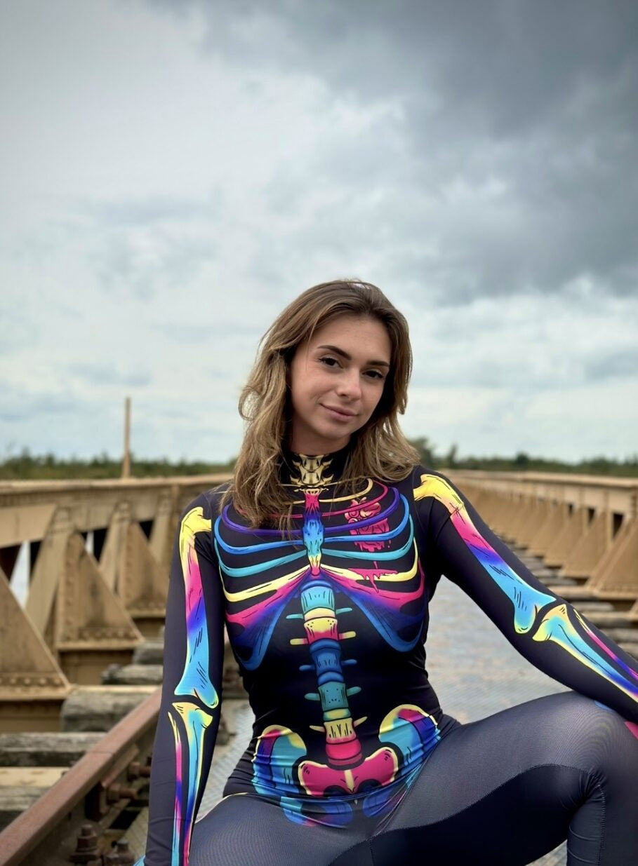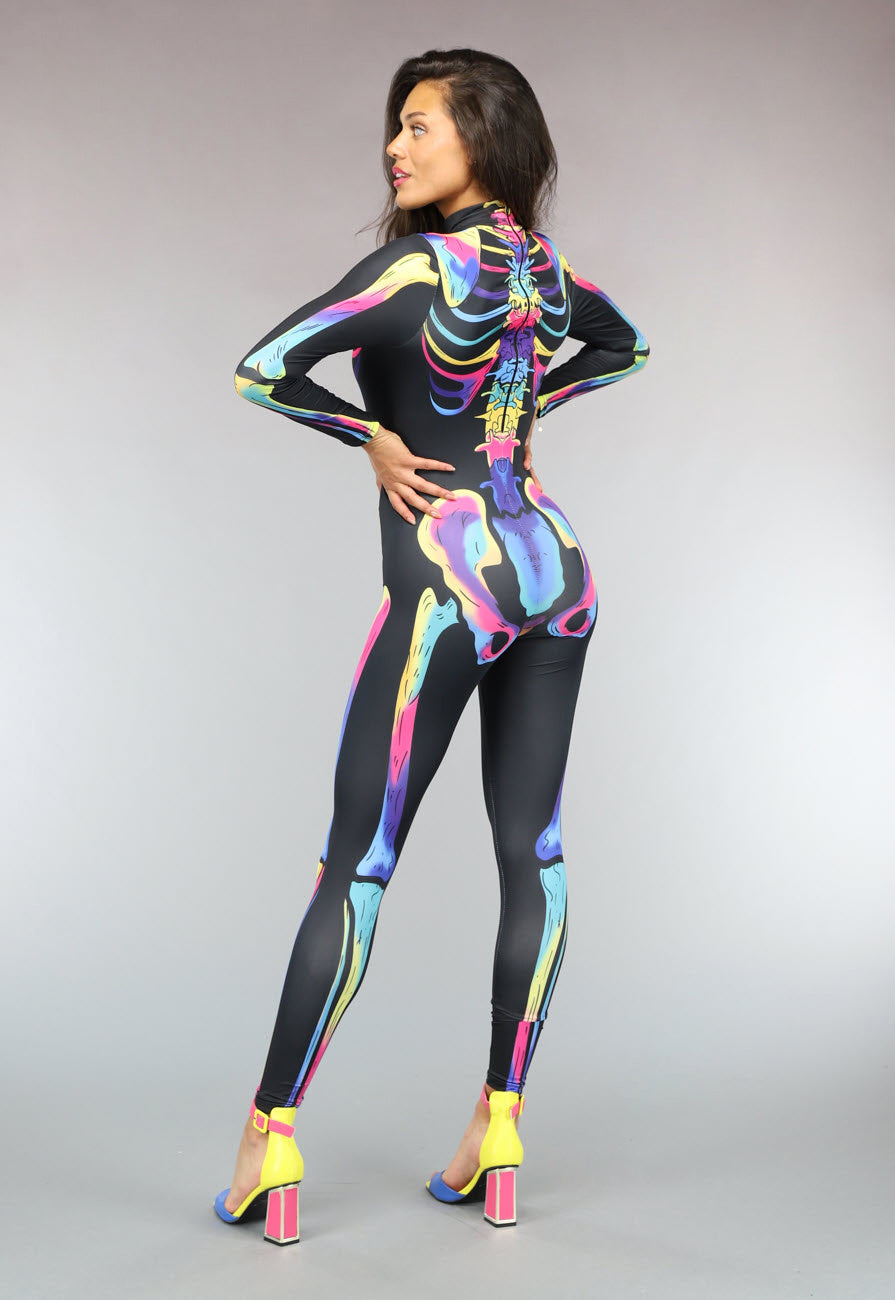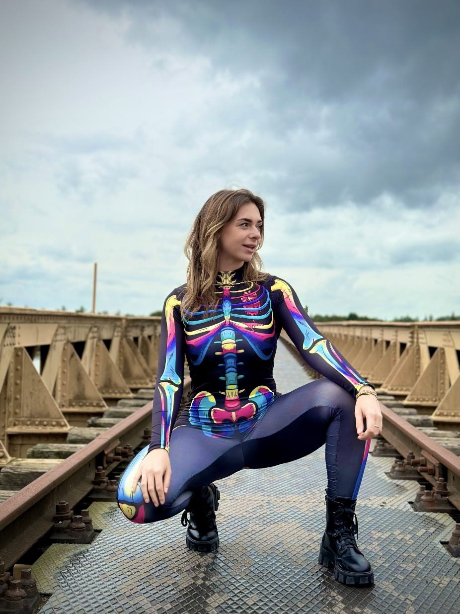 Deze mooie jumpsuit is gemaakt van elastische stof en heeft veel stretch. De jumpsuit heeft een hoge kraag met een ritssluiting aan de achterzijde en lange mouwen. De jumpsuit is voorzien van een skelet print en is ideaal voor een Halloweenfeestje of speciale gelegenheden!
