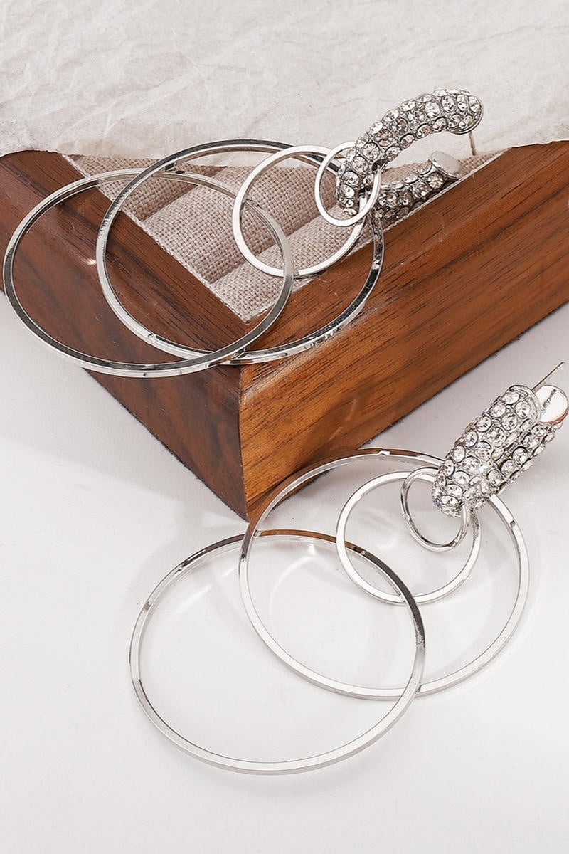Deze oorbellen bestaan uit meerdere verbonden ringen in een goudkleurige afwerking. Het bovenste deel heeft een gebogen element dat volledig is bezet met kleine strasssteentjes. De ringen hebben een dun en glad profiel en zijn licht van gewicht. De oorbellen worden bevestigd met een standaard steker en metalen sluiting.