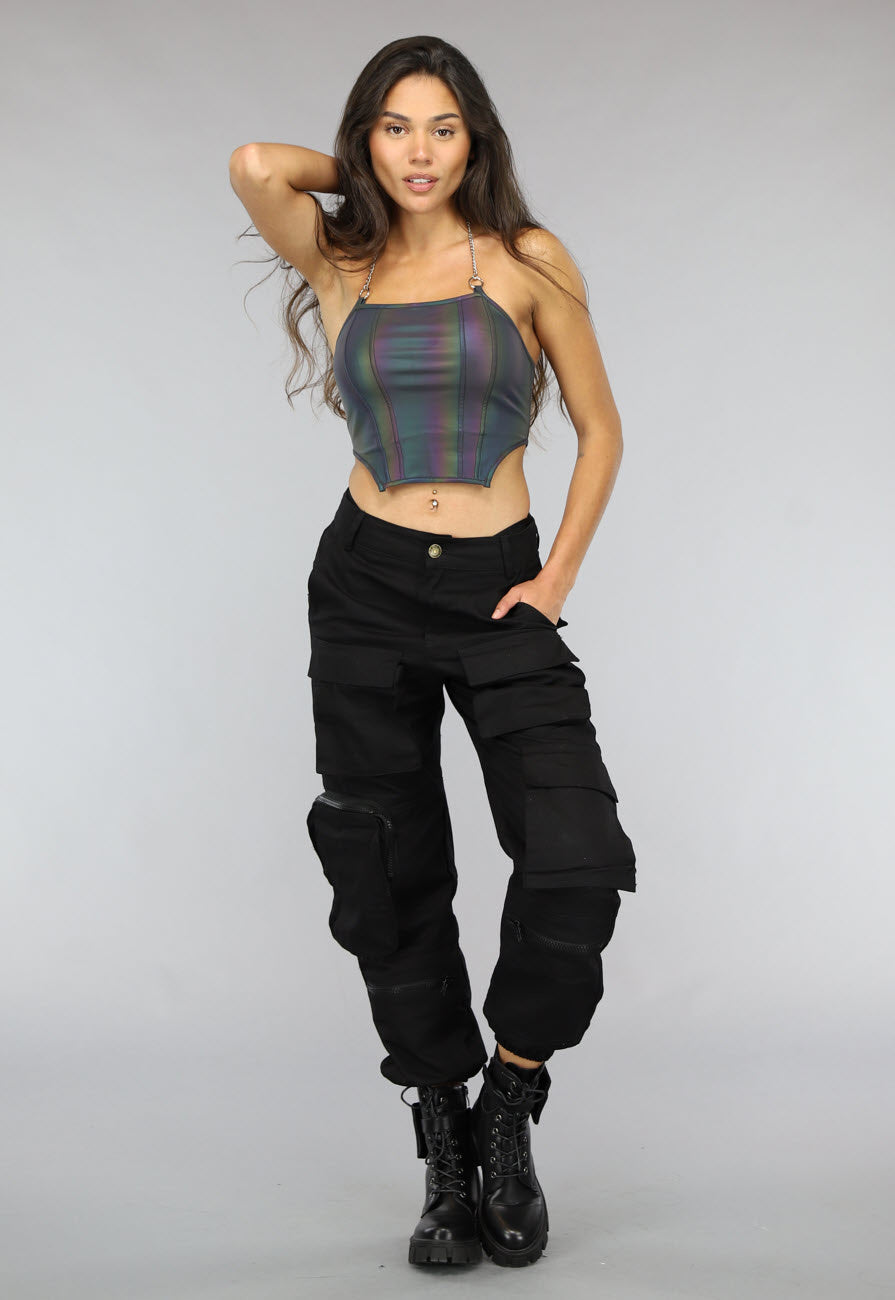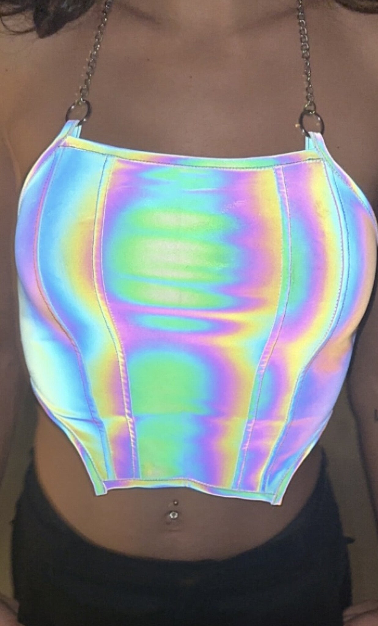 Deze gave top is gemaakt van een stevige reflecterende stof. De top heeft een halter model met een ketting in de nek welke niet te verstellen is. De top is kort en is perfect voor indoor festivals!