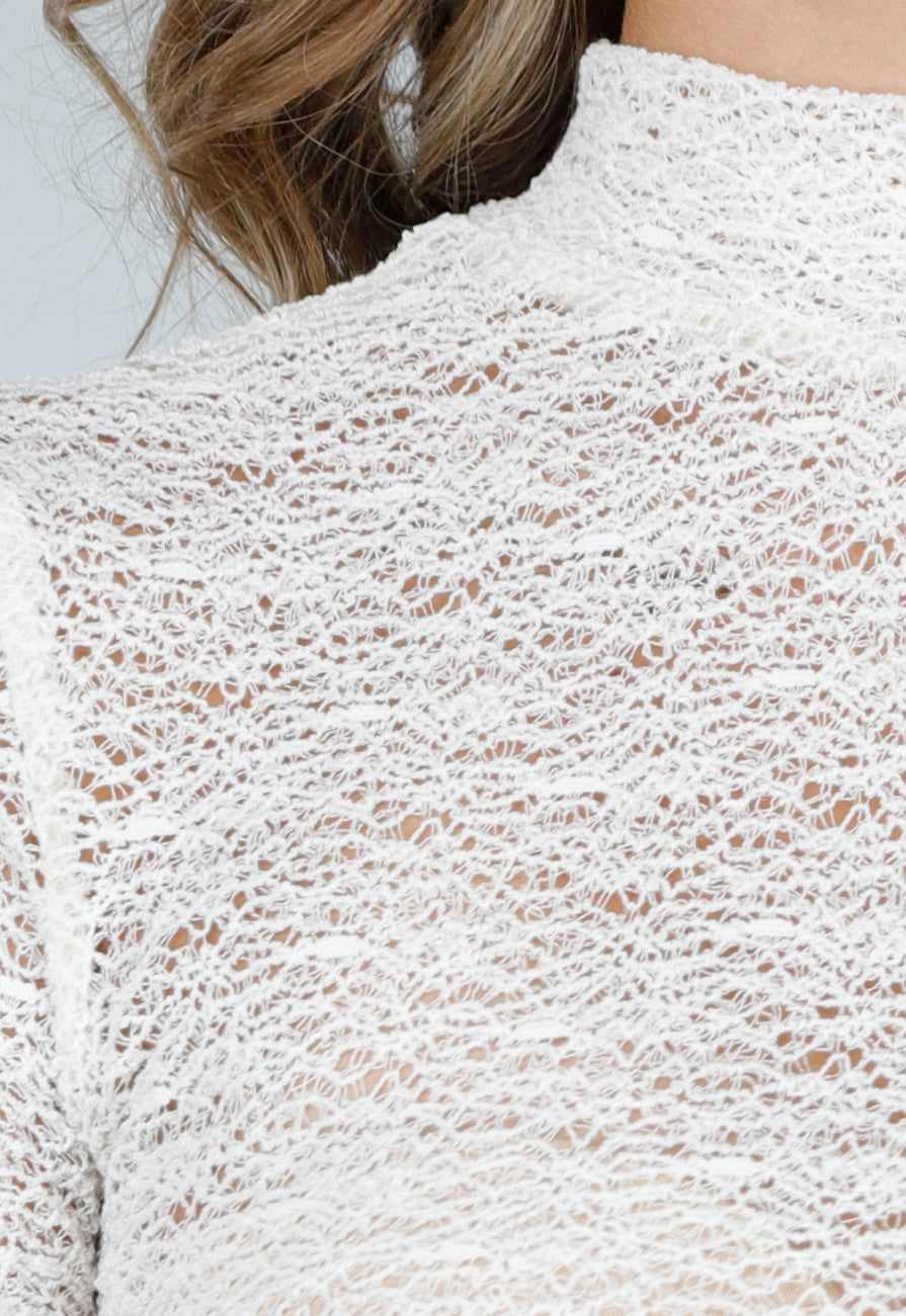 Deze top is gemaakt van elastisch gehaakt materiaal in gebroken wit. De stof is opengewerkt en doorschijnend. Het model heeft korte mouwen en een aangesloten colkraag. De pasvorm is nauwsluitend dankzij de stretchkwaliteit.