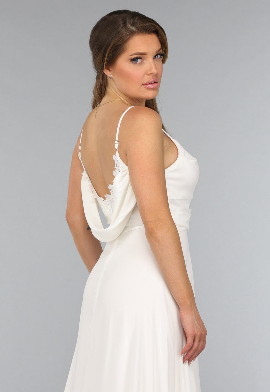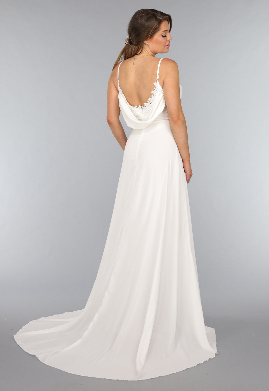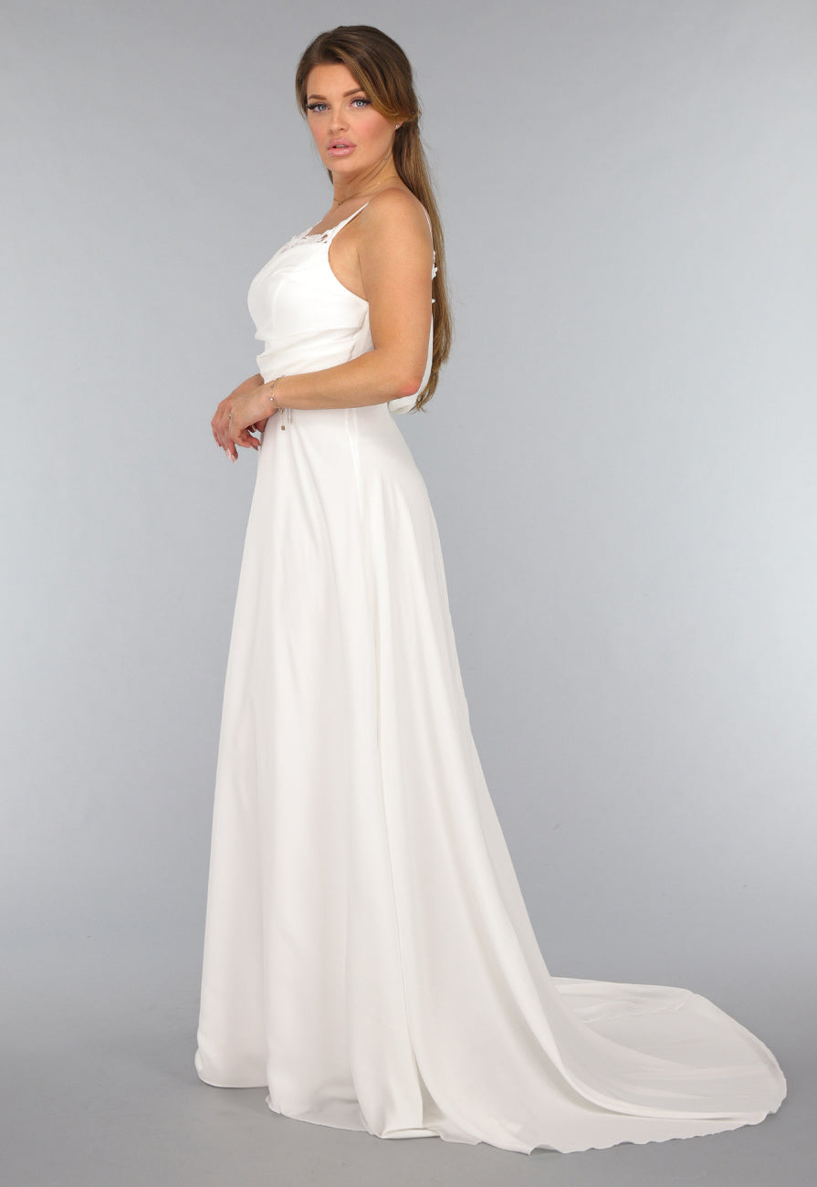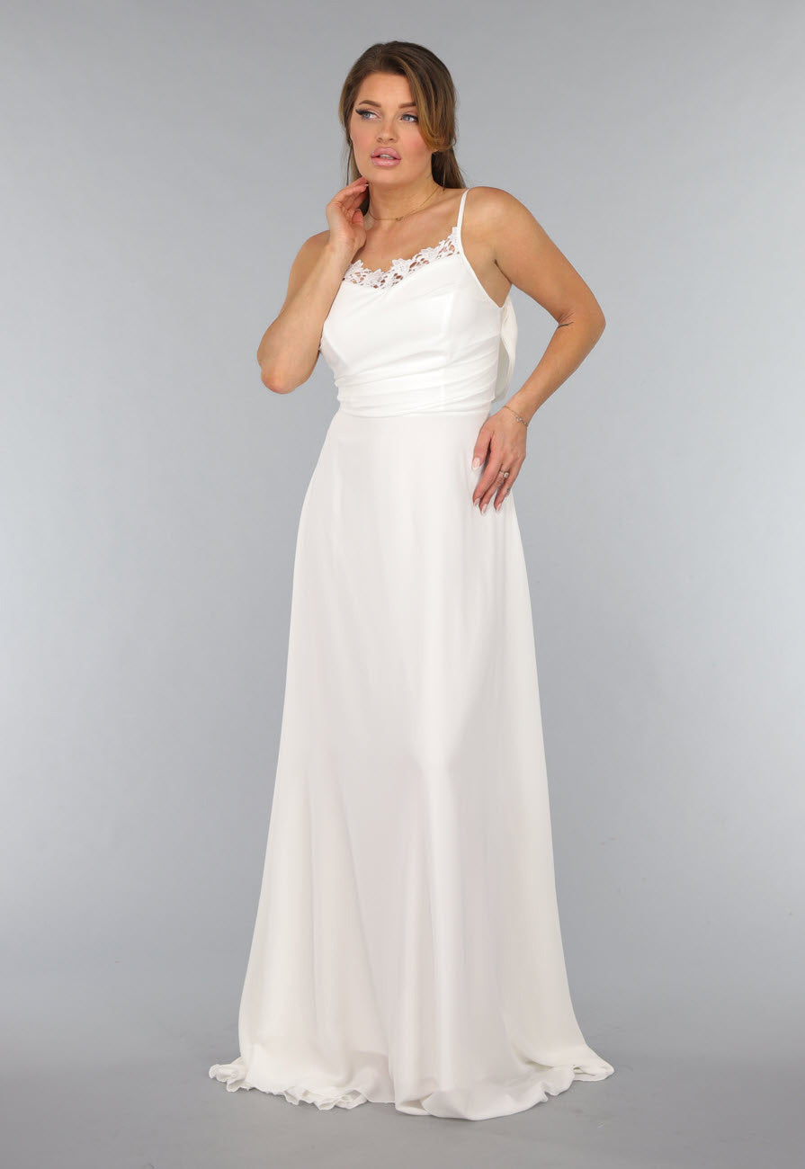 Deze lange bruidsjurk heeft verstelbare spaghettibandjes en een v hals. De jurk is voorzien van een kanten detail langs de halslijn en valt tot de grond. Op de rug zit een blinde ritssluiting waardoor je de jurk gemakkelijk aan en uit kan trekken. Bovendien is deze prachtige jurk voorzien van een gedrapeerd detail op de rug en een sleep.