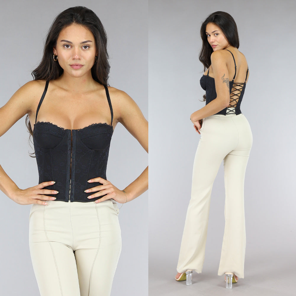 Deze zwarte korset top bevat voorgevormde cups met beugel, waardoor het dragen van een bh volledig onnodig is. Verder beschikt het topje over een haaksluiting en verstelbare vaste spaghettibandjes. De achterzijde van het topje heeft een mooi rijgwerk welke je echter niet kunt verstellen. Het topje is bedekt in kanten details waardoor hij prachtig oogt.