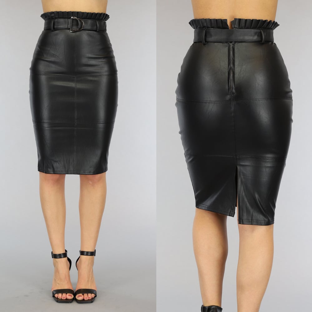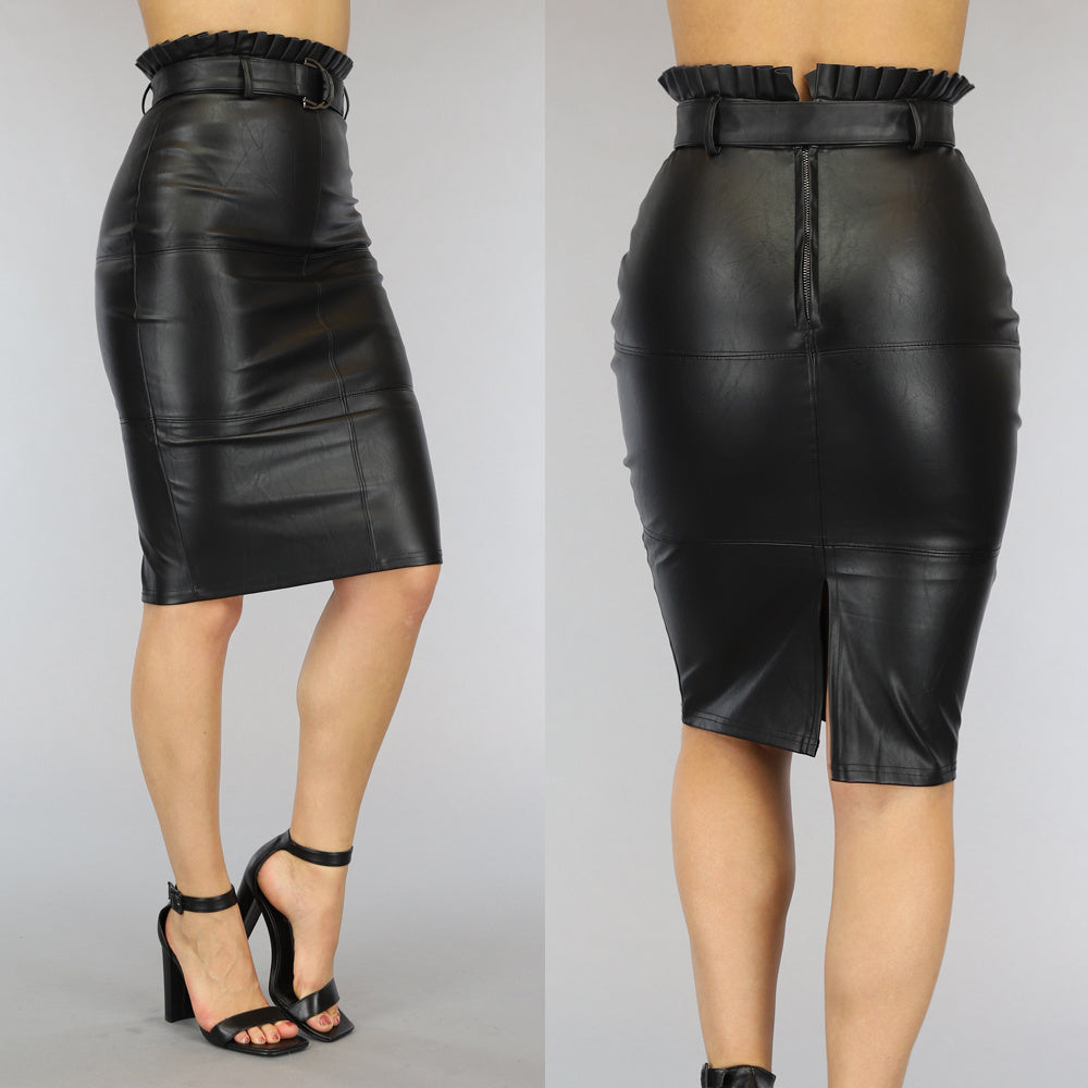 Zwarte Lederlook Kokerrok met Riem en Ruches