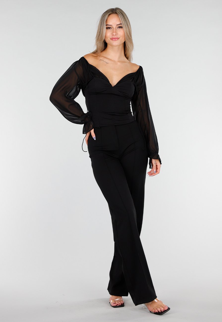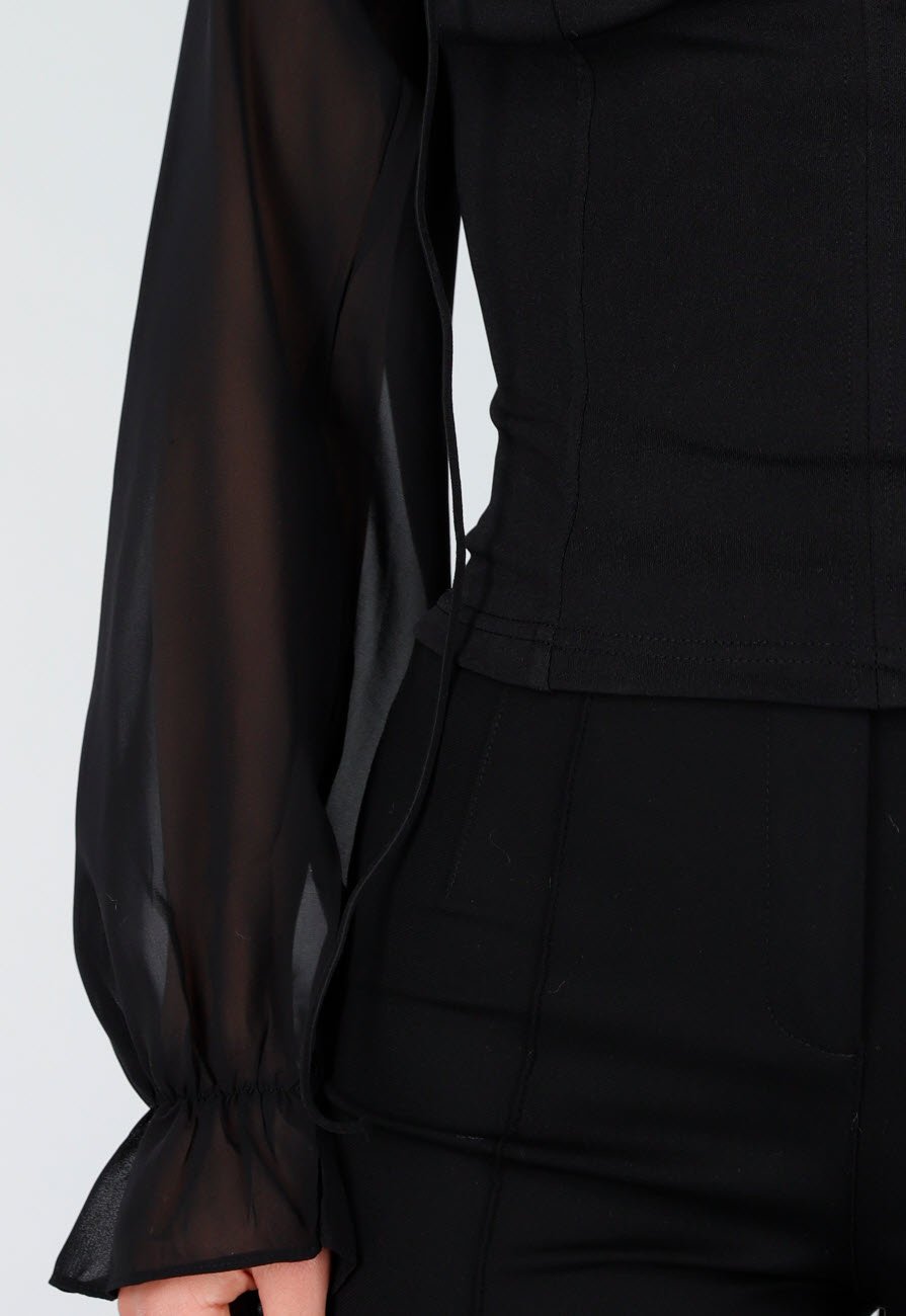 Deze zwarte top is uitgevoerd met een vaste korsetstructuur en doorzichtige mesh mouwen. De halslijn is voorzien van een striksluiting, die het model extra detail en vorm geeft. De mouwen zijn licht gepoft en afgewerkt met elastische manchetten. Het lijfje heeft een verstevigde pasvorm die mooi aansluit op het lichaam en zorgt voor een elegante, gedefinieerde uitstraling.