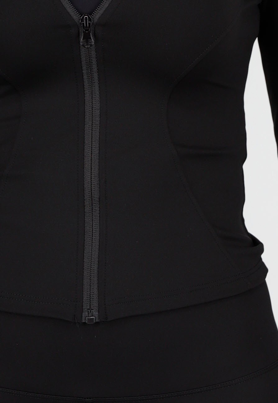 Deze zwarte 2-piece set bestaat uit een strak aansluitende legging met hoge taille en een getailleerd vestje. Het vestje heeft een opstaande kraag, lange mouwen met duimgaten en een doorlopende ritssluiting aan de voorkant. Beide delen zijn uitgevoerd in een gladde en elastische stof. De legging loopt nauw toe tot aan de enkels en het vestje valt op de heup.