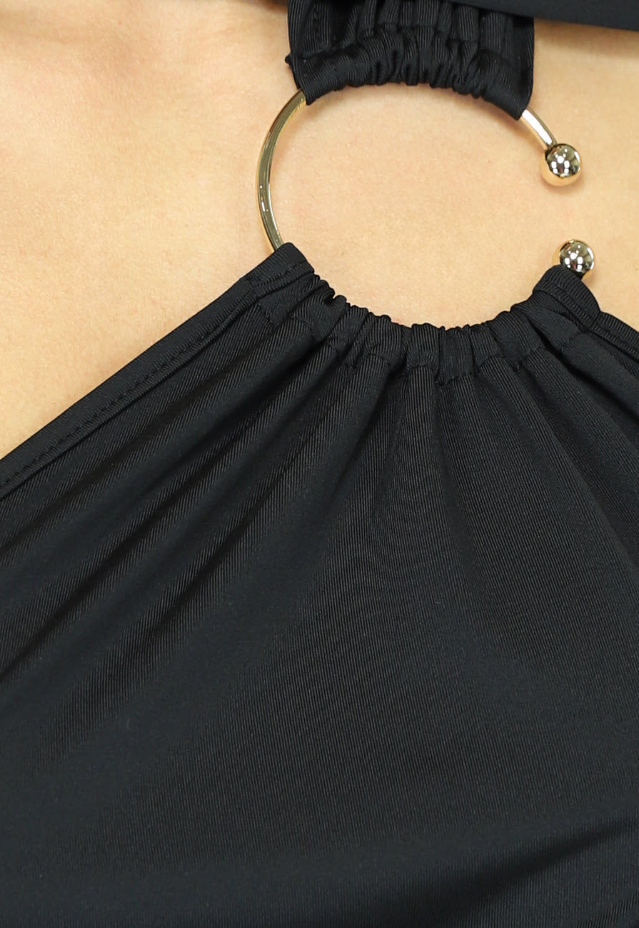 Deze geweldige feestjurk is perfect voor de feestdagen! De jurk is gemaakt van een luchtige elastische stof. De rok valt erg lang en heeft een hoge split. De jurk valt op meerdere plekken geplooid. Het bovenstuk van de jurk heeft een asymmetrisch design met een one shoulder model welke is afgewerkt met gouden ringen. Op de achterzijde is de jurk afgewerkt met een soort sleep look.