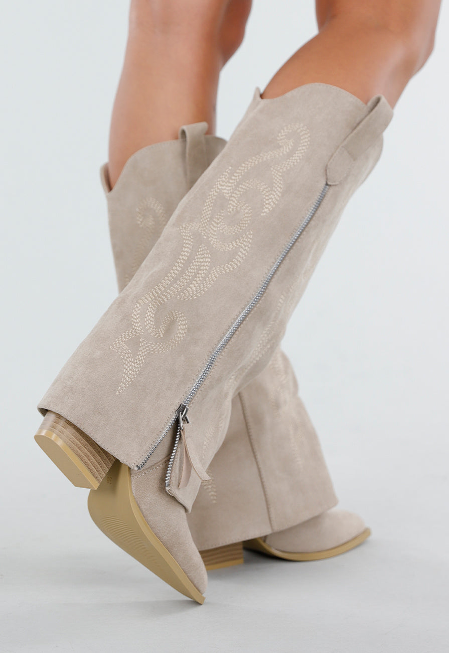 Deze beige cowboylaarzen zijn uitgevoerd in een zachte suèdelook met een hoge schacht voorzien van ton-sur-ton borduursel. De bovenrand is gesneden in een lichte V-vorm en afgewerkt met lussen aan beide zijden. Langs de buitenzijde loopt een zichtbare rits die volledig opent. De laars heeft een spitse neus en een losvallende bovenlaag over de wreef. De hak is middelhoog en uitgevoerd in een bijpassende beige kleur met lichte zool.