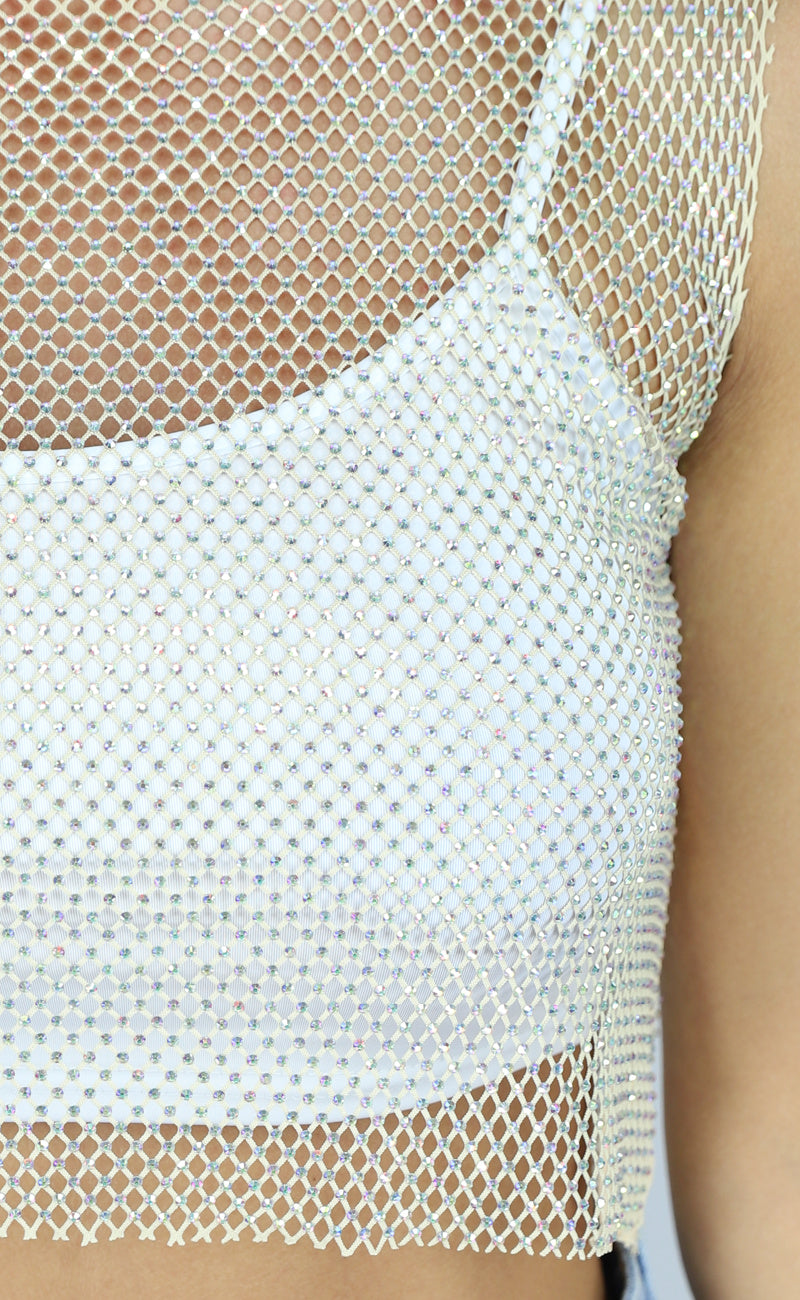 Dit te gekke topje is gemaakt van een fishnet materiaal en is bedekt met strass steentjes, zodat jij kan shinen op je favo festival! Het topje heeft een tank top model en valt bij de hals wat hoger.